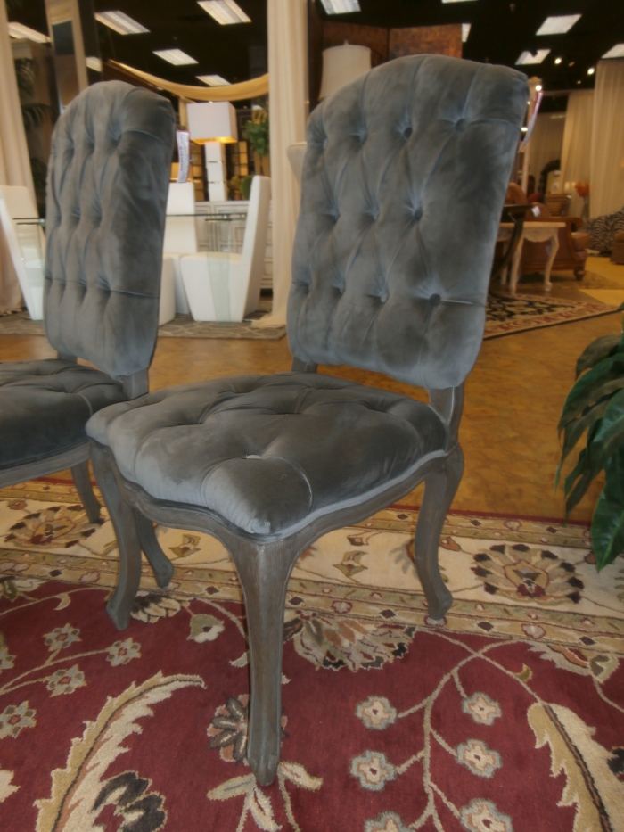 The Laurel chair in a tufted grey velvet set on an antique, rubbed wood frame. Gorgeous French style legs and rich fabric. Perfect for a formal dining table. Measures 25x40. Several at time of posting.