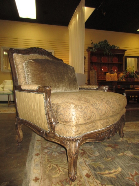 Bentley Churchill chair & a half in a mix of patterned upholstery on gold brushed wood frame with nailhead trim. Comes with a plush accent pillow. Love these fabrics! 41"W x 44"D x 43"H. Was $1,799 new. Incredible!