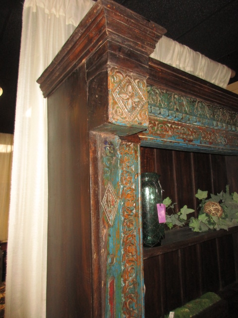 Temple door solid reclaimed wood bookcase in a distressed finish. Love all the blue & green in this. There are three shelves. Unique, rustic piece! Could go in an office or living room. 64"wide x 22"deep x 91"high.