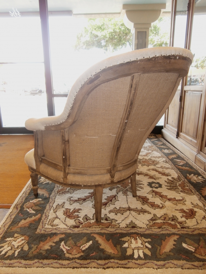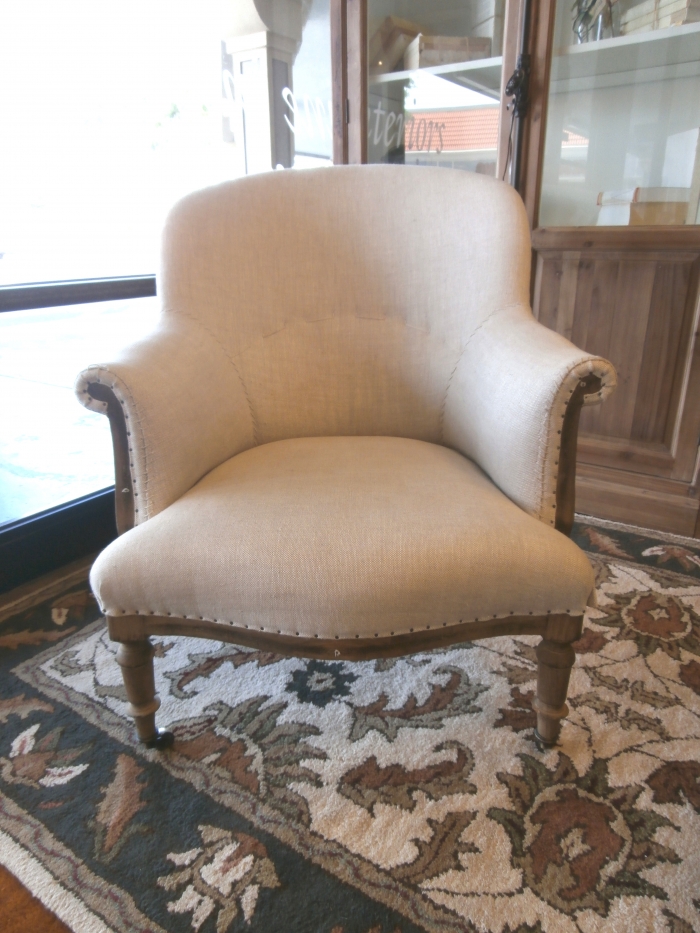 Restoration Hardware Deconstructed chair in a distressed walnut frame, accented with nail tacks, is complemented by the texture of burlap and fabric. Measures 28*29*35.Two in store at time of posting.