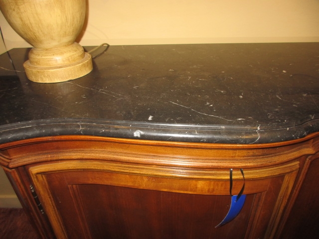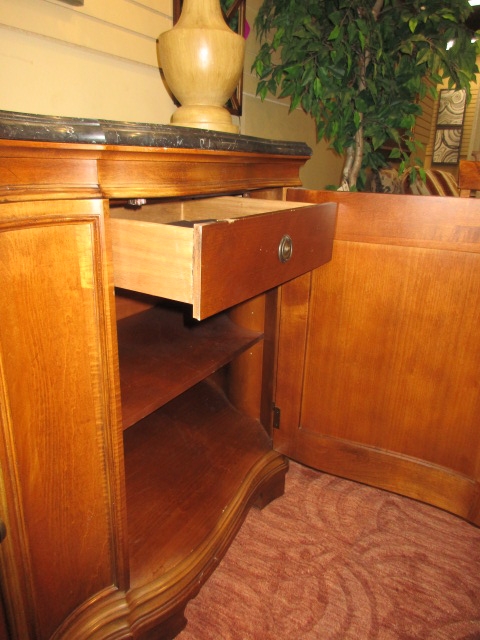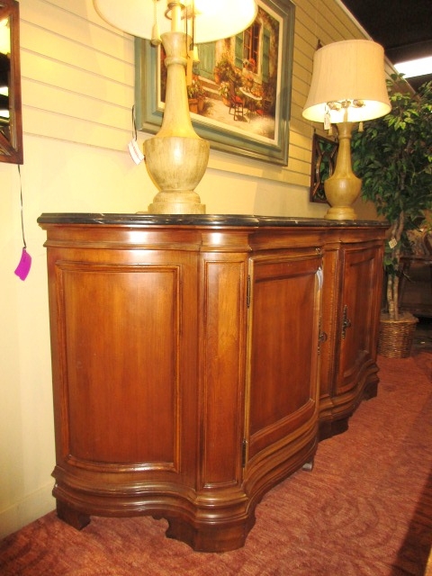 Bernhardt transitional style, two door buffet in a medium finish with black stone top. There is one shelf and one drawer behind either door. 78"long x 23"deep x 38"high.
