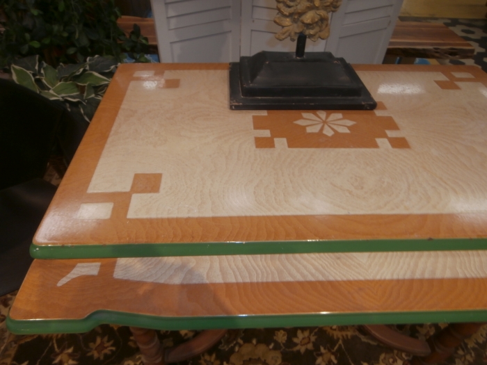 Fabulous orange and brown vintage 1930's deco enamel/porcelain/tin top dining kitchen table with sliding leaves. Measures 40*25*2(10") extensions.