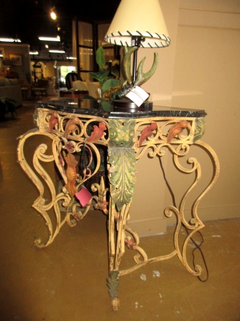 Gold metal entry table with black stone top. Love the red & green painted accents. Unique table for your home. 39"long x 20"deep x 30"high.