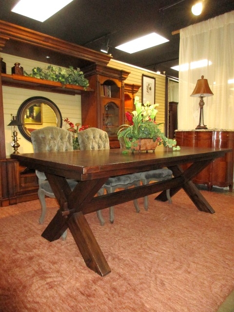 Pottery Barn dark wood Toscana trestle dining table. Perfect for a more rustic or farmhouse style home. 89"L x 40"W; (2)18"lfs. Gets large enough to seat all your guests.
