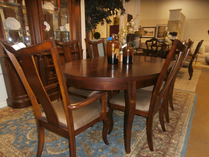 Round to oval dining table on saber front legs with five (consider it four and one for free) dining chairs. Measures 60*48*1(14").