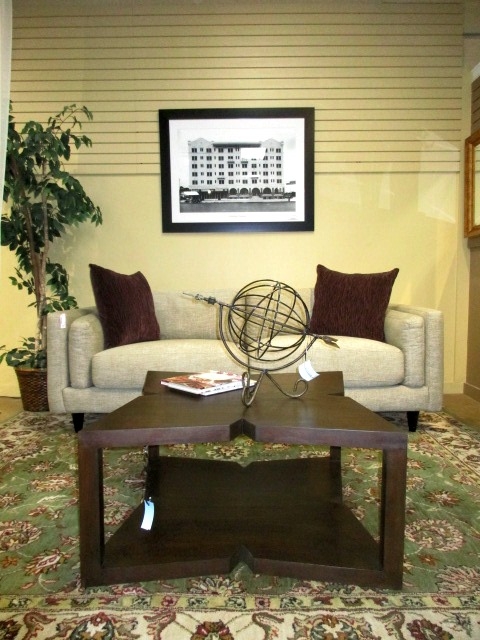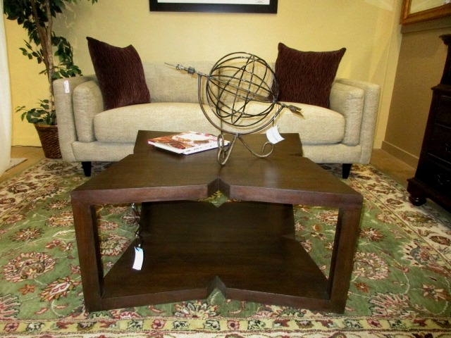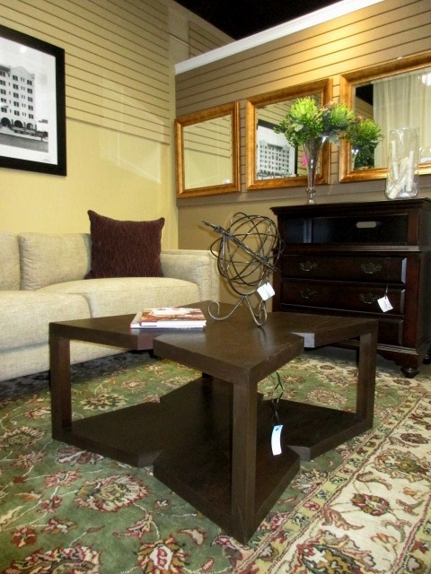Scott coffee table in a smooth dark finish. The unique shape gives this streamlined table a bit more pizzazz. Great centerpiece for your room. 36"wide x 36"deep x 18"high.