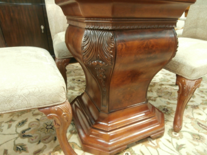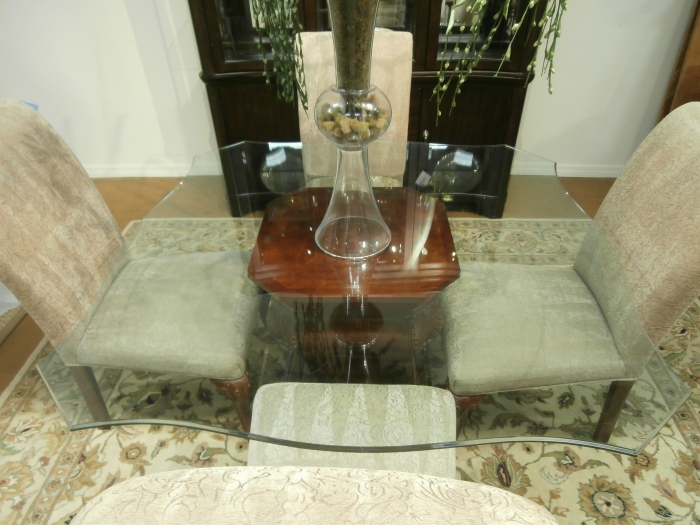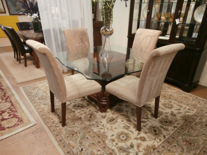 Unique glass top Bombay dining table with four upholstered chairs and a traditional base. Measures 55*55*29 in brown and creme.