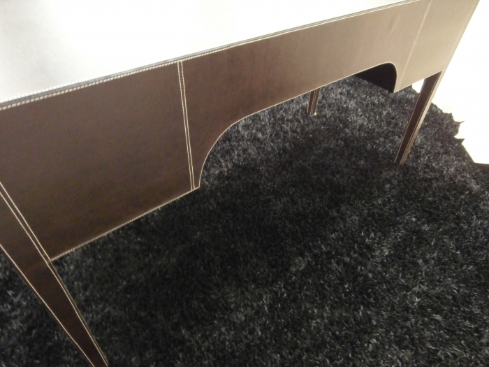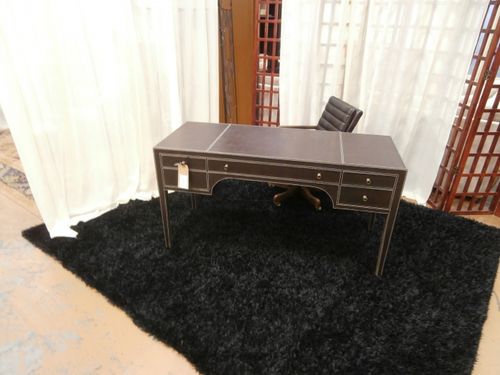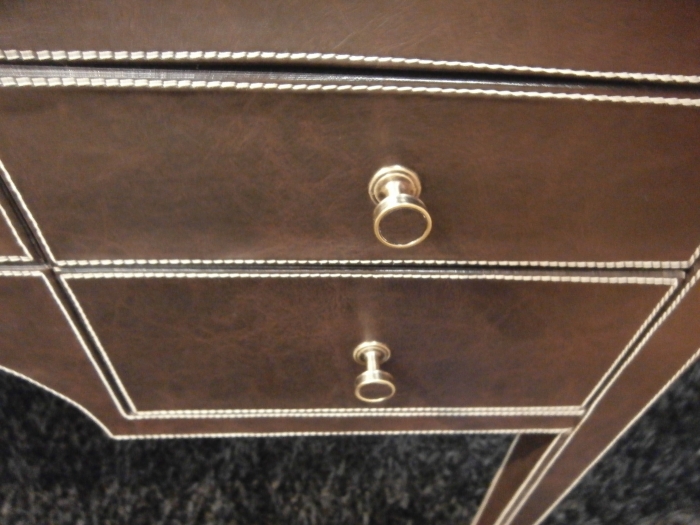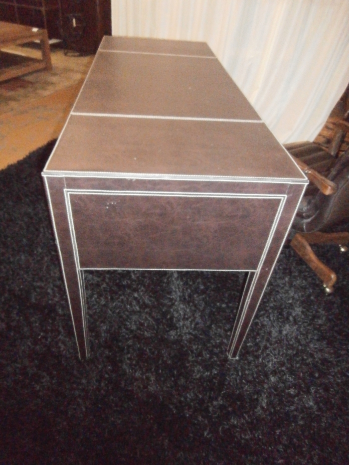 Handcrafted Vienna walnut bonded leather wrapped desk with contrasting stitching. Measures 60*24*32 in brown.