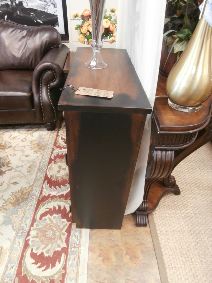Pottery Barn’s Andover Cabinet has such a unique finish, it makes a great focal point for a living room. Put this under your wall hung TV for a great look. Measures 37*15*36 in brown and black.