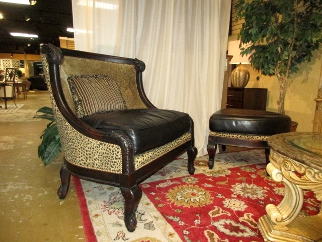 Bentley Churchill chair in an animal print upholstery with black leather seat & matching leather ottoman on dark wood frame. Stunning chair! A focal piece for your room. 41”W x 39”D x 43”H. At posting, we have two.