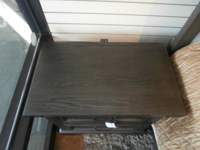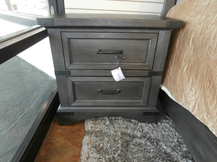 This Vickery Creek nightstand is a blend between function and beauty. Its oak veneers boast a pewter gray finish with wire-brushing and is accented by antique pewter hardware and USB ports. Measures 28*17*28.