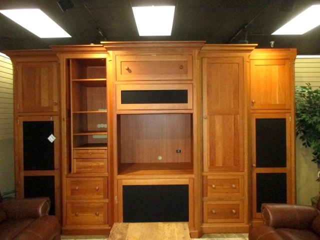 Large five piece entertainment center in a smooth medium finish with black mesh panels. Plenty of drawer and shelf space throughout. Great find for a living room or office. 170"long x 36"deep x 97"high.