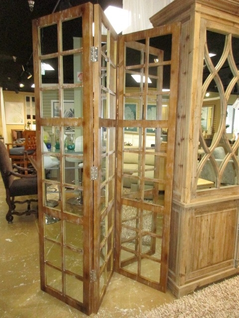 Weathered wood, three panel screen with mirrored front. Love the height on this screen! Visually so impressive. Each panel measures 20"wide x 84"high. Perfect room divider for your home.