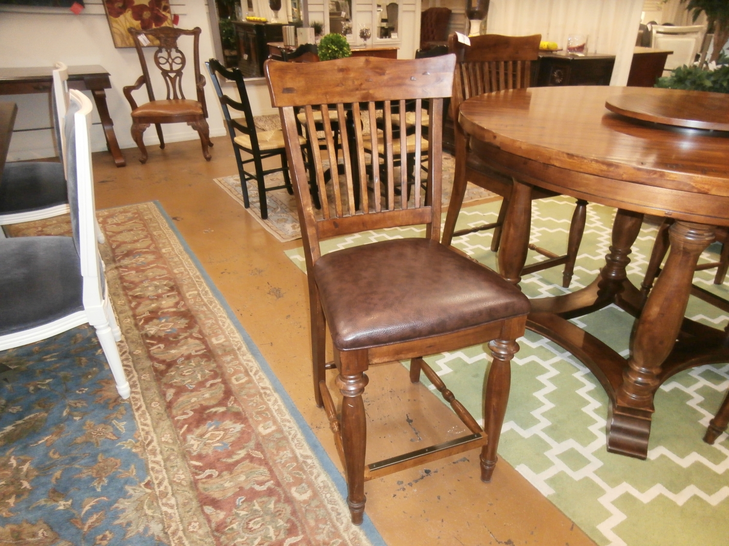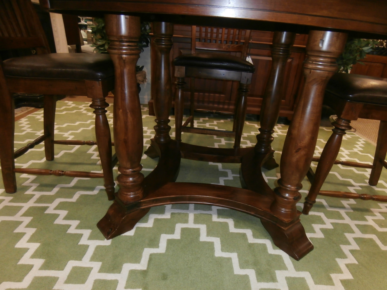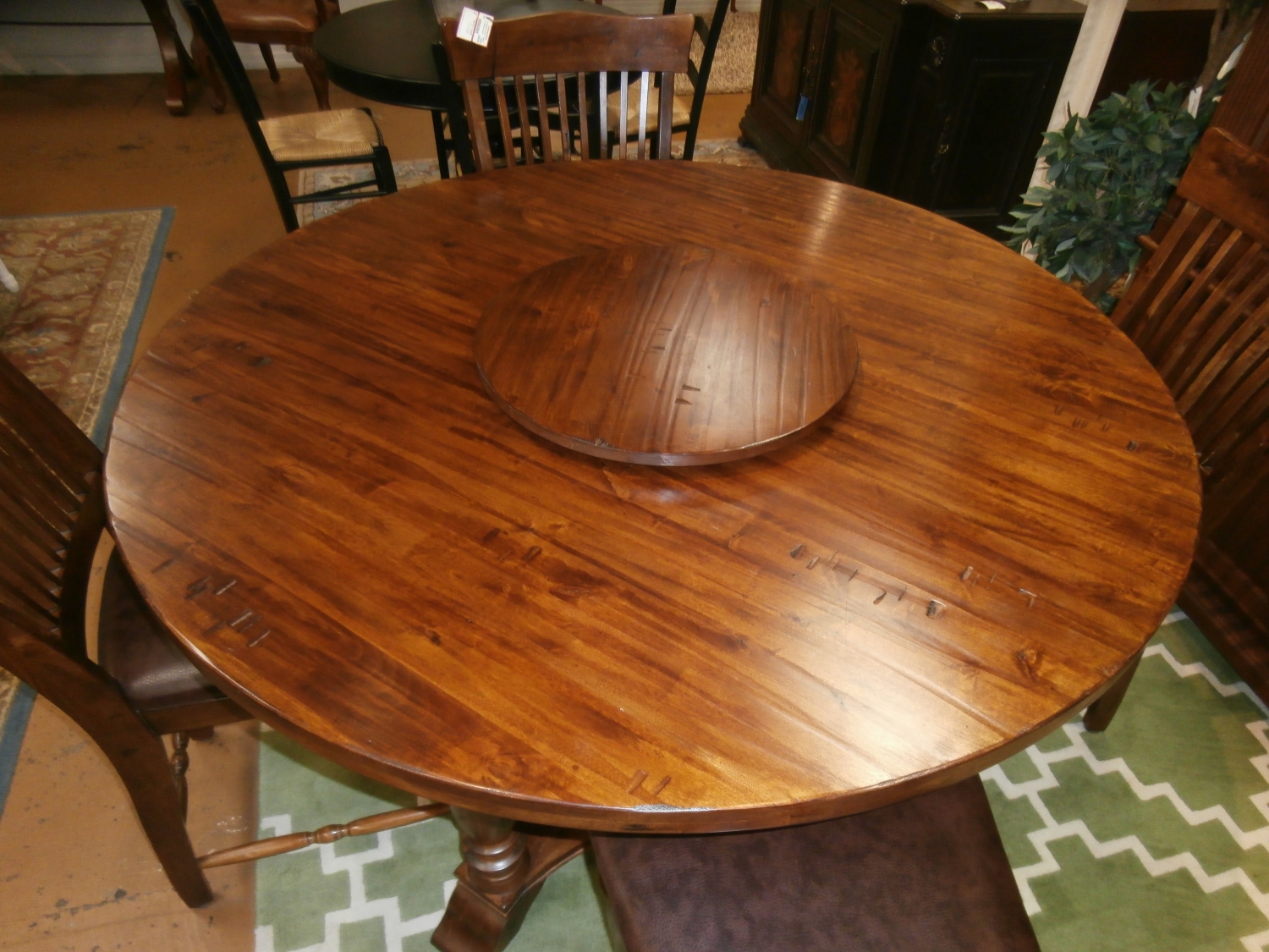 Beautiful round wood pub table with lazy Susan. This comes with four slat back chairs. Measures 54"D,37"H in brown.