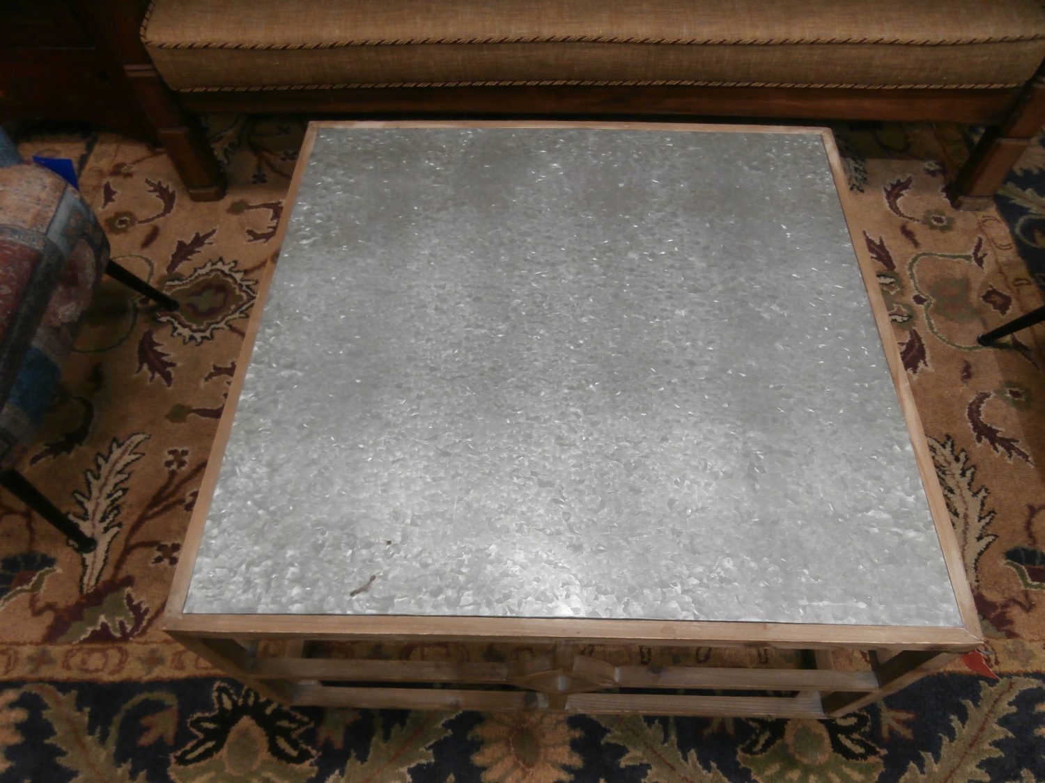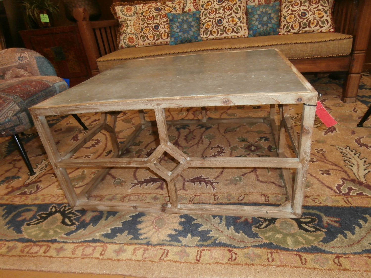 Incorporate small designs that make a huge difference with this coffee table. It consists of a metal table-top and an exposed wood bottom with a diamond center on each side. Measures 36"W,36"D,18"H.