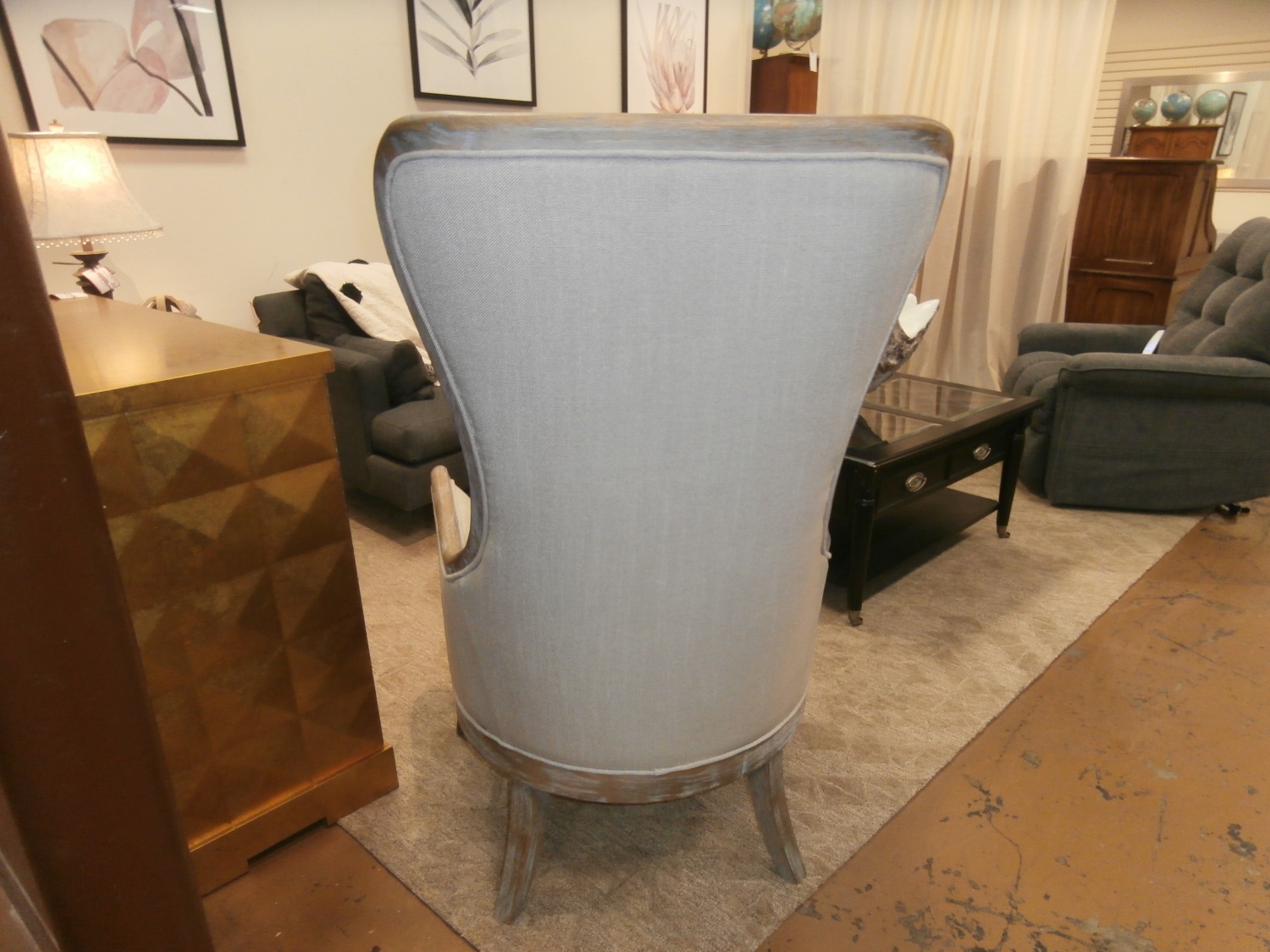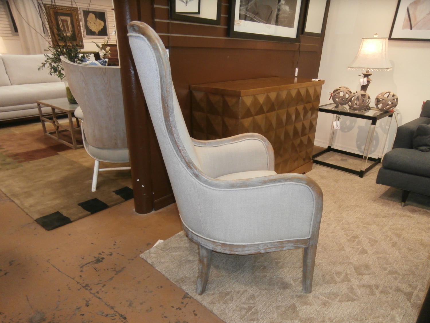 The Cleveland Chair features a high back with a distressed wood frame around soft white French linen upholstery. The seat is wide and the back wraps around in an embrace. Measures 28"W,32"D,49"H.