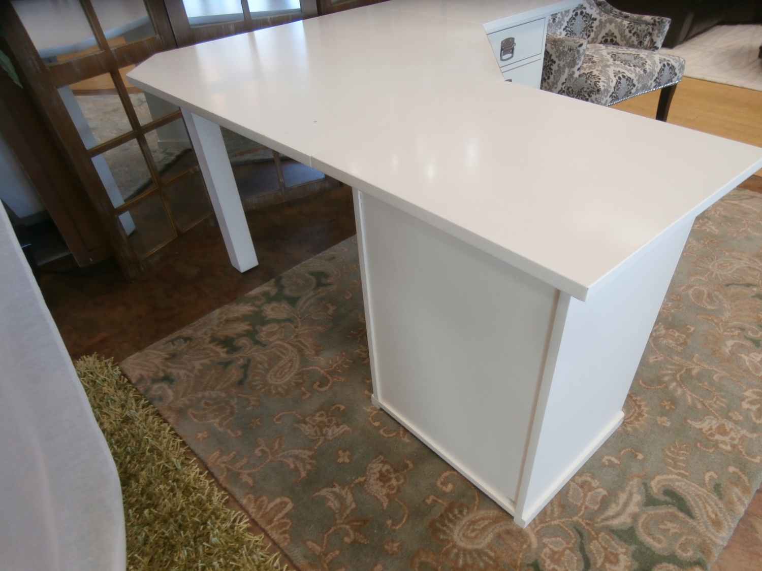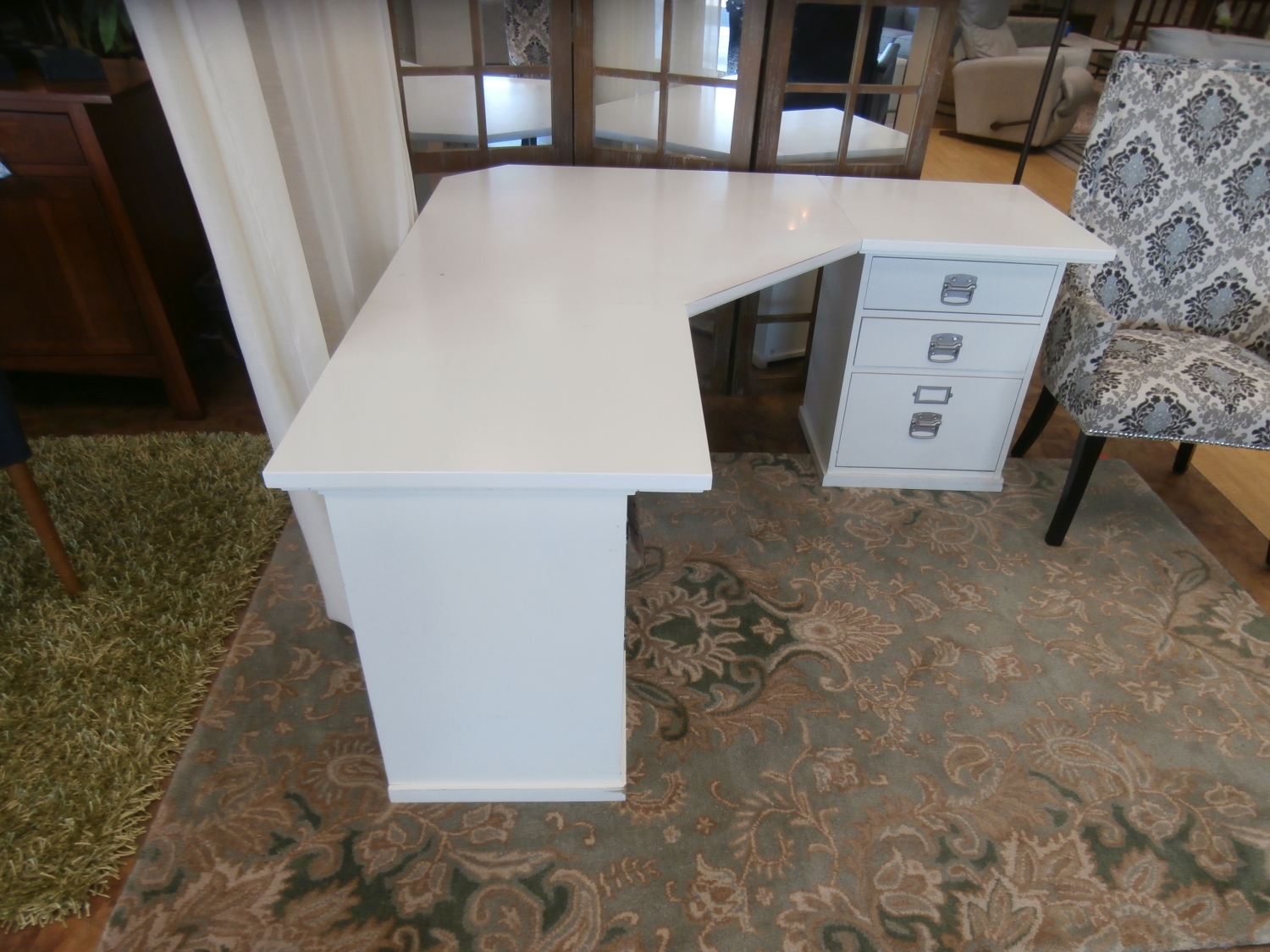 Pottery Barn Bedford desk. This corner desk provides a spacious work area between two file cabinets and has a support leg for maximum stability. Measures 63"W,63"D,30"H in white.