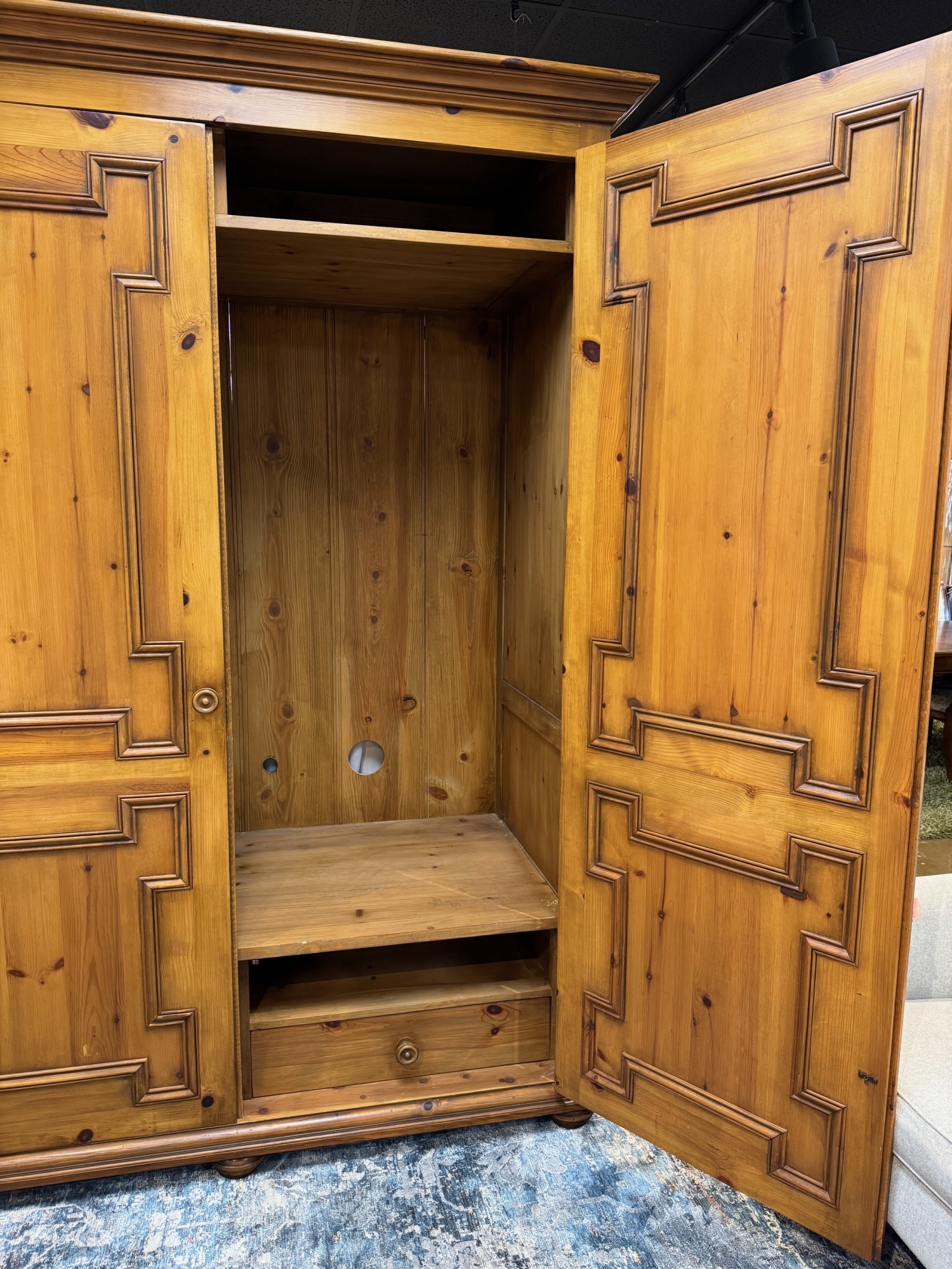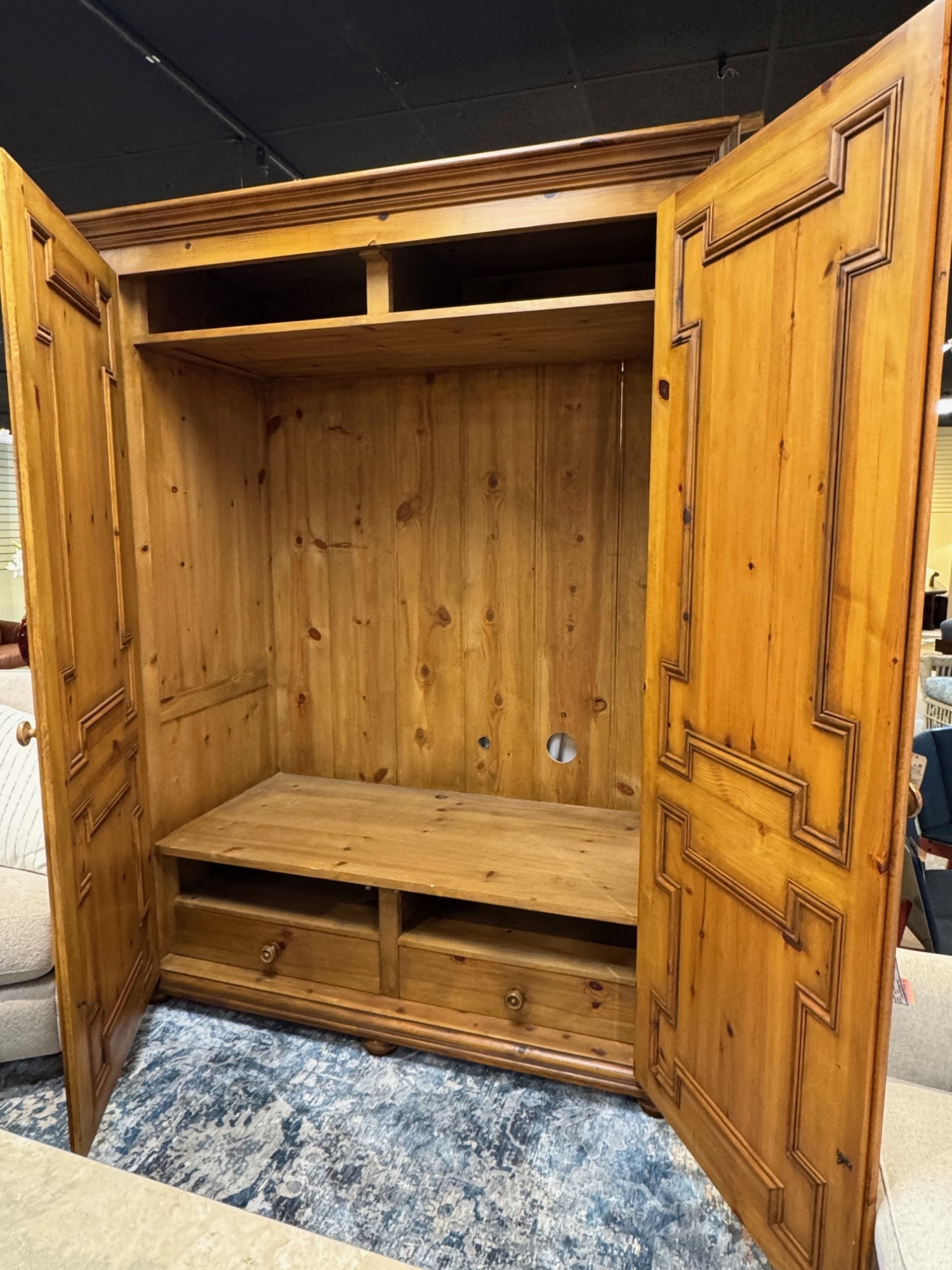 Large rustic carved pine media cabinet. Ample storage space inside with two drawers below and cubby space above. Would be a great wardrobe as well. Gorgeous craftsmanship. 72"W x 36"D x 96"H.