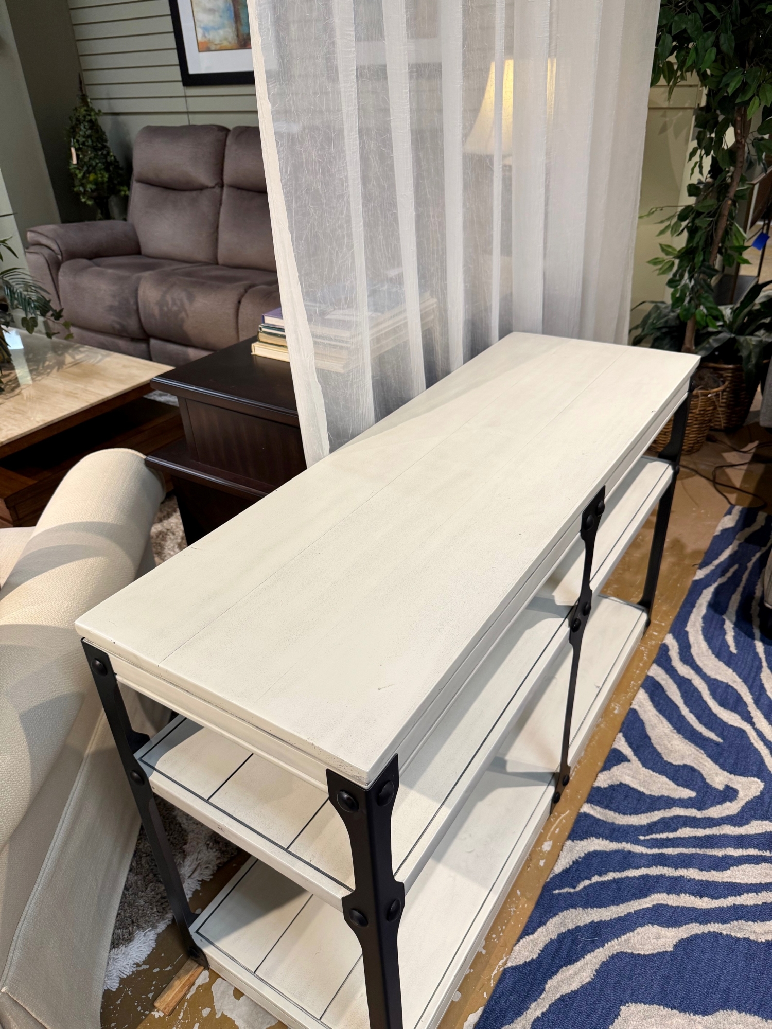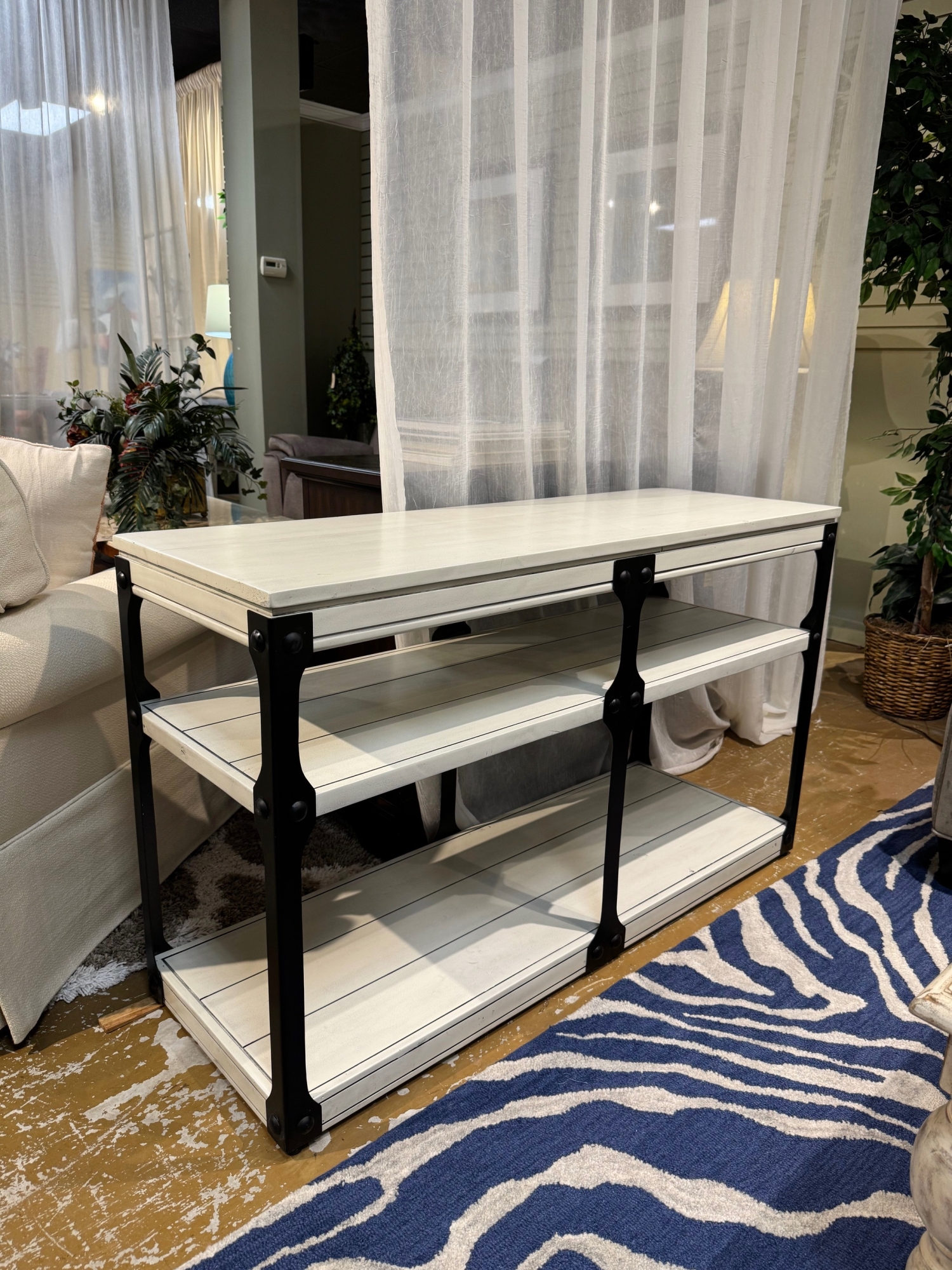 Fairview rustic console table in white on black metal frame. There are two shelves below. 50"long x 17"deep x 30"high.