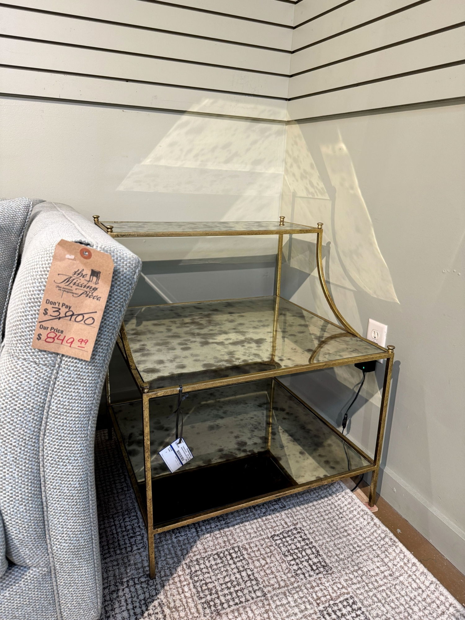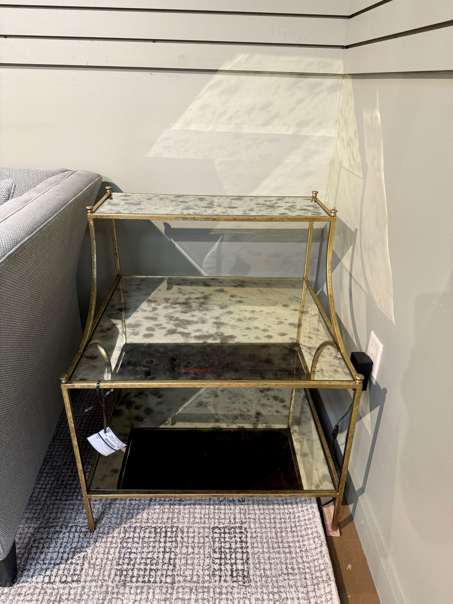 Ballard Emeline tiered accent table in gold with antiqued mirror shelves. Offers storage and display space in an airy, elegant design. 26"wide x 24"deep x 25"high.