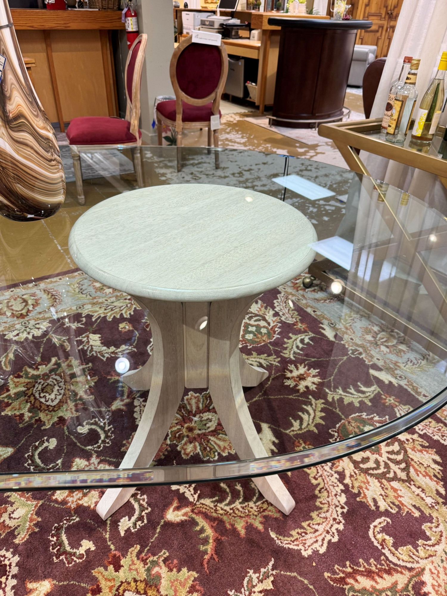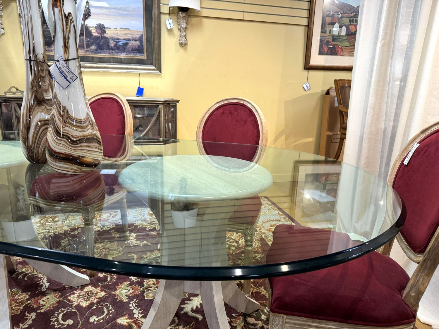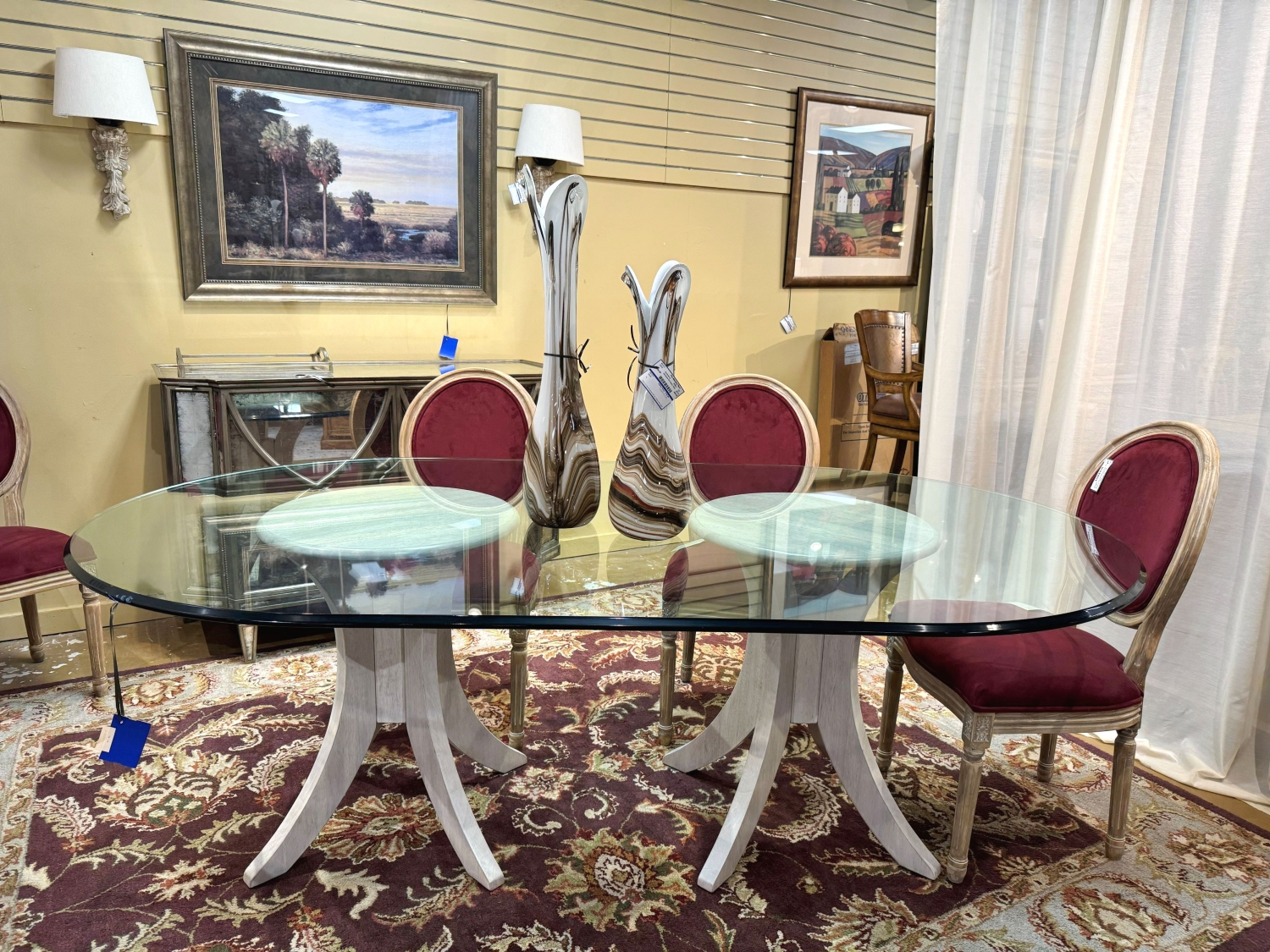 John Thomas contemporary style oval shaped glass top dining table on cream wood double pedestal bases. Sleek, modern lines. Measures 88"long x 50"wide.