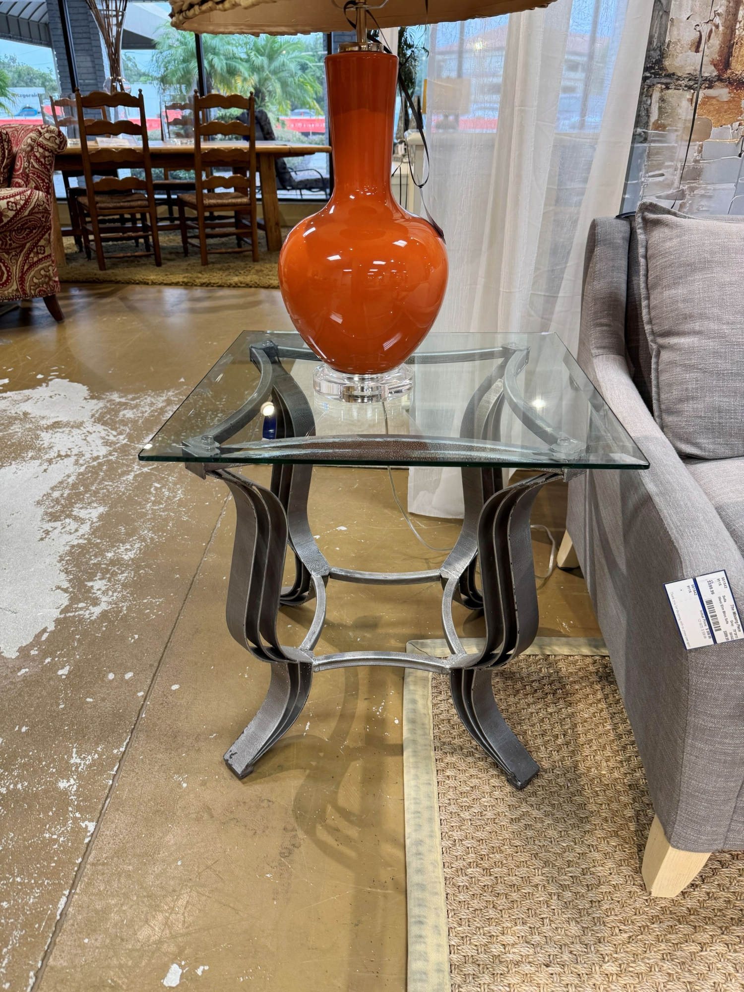 Glass top end table on distressed gray metal legs. 24"square x 23"high. At posting, we have the matching coffee table.