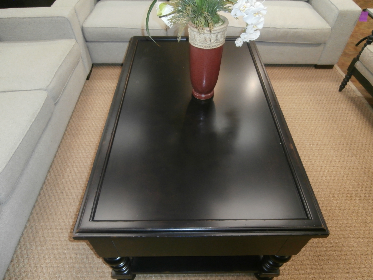 Tommy Bahama Kingstown coffee table in a rubbed tamarind finish. There are two drawers & a shelf below. Nice, British colonial style. Measures 54"W,32"D,25"H with matching pieces at time of post.