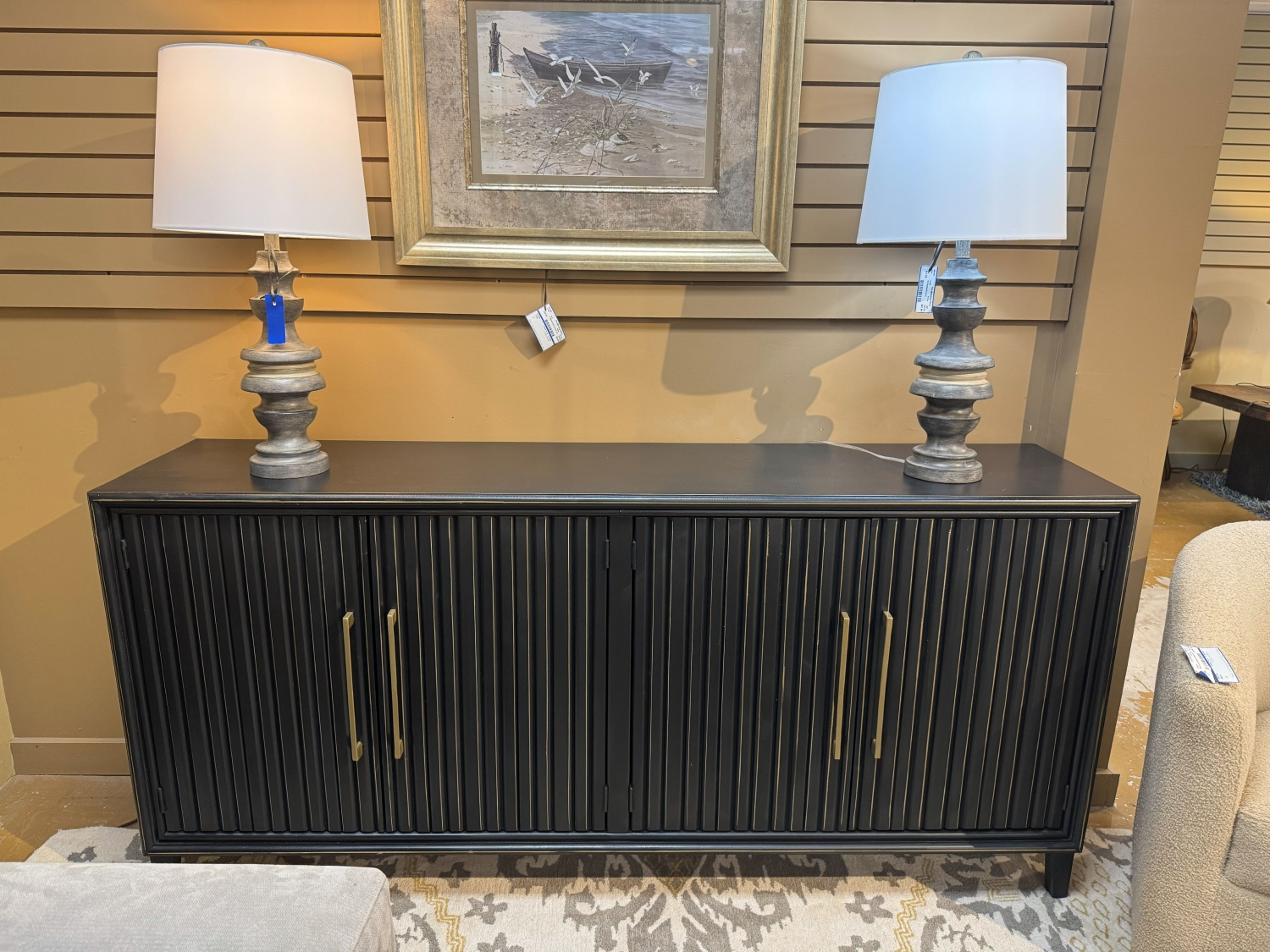 Riley four door ribbed cabinet in a lightly distressed black finish. There is one shelf behind each set of doors. Great accent piece for any room. 72"long x 17"deep x 34"high.