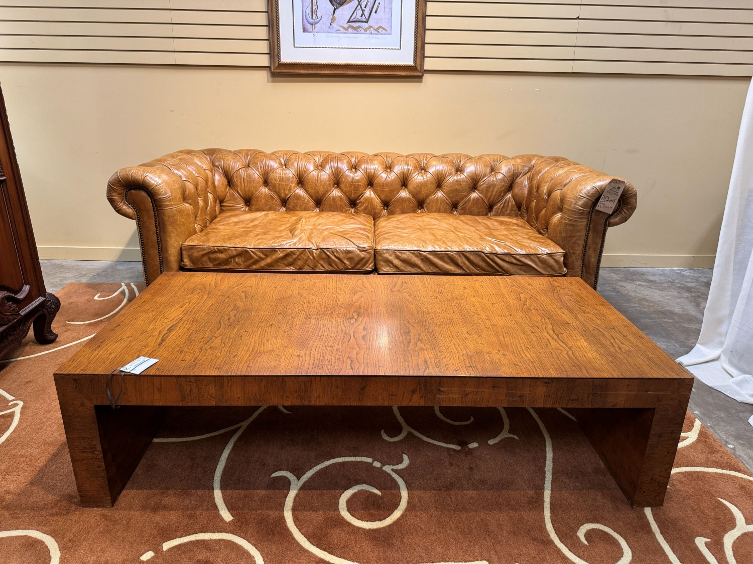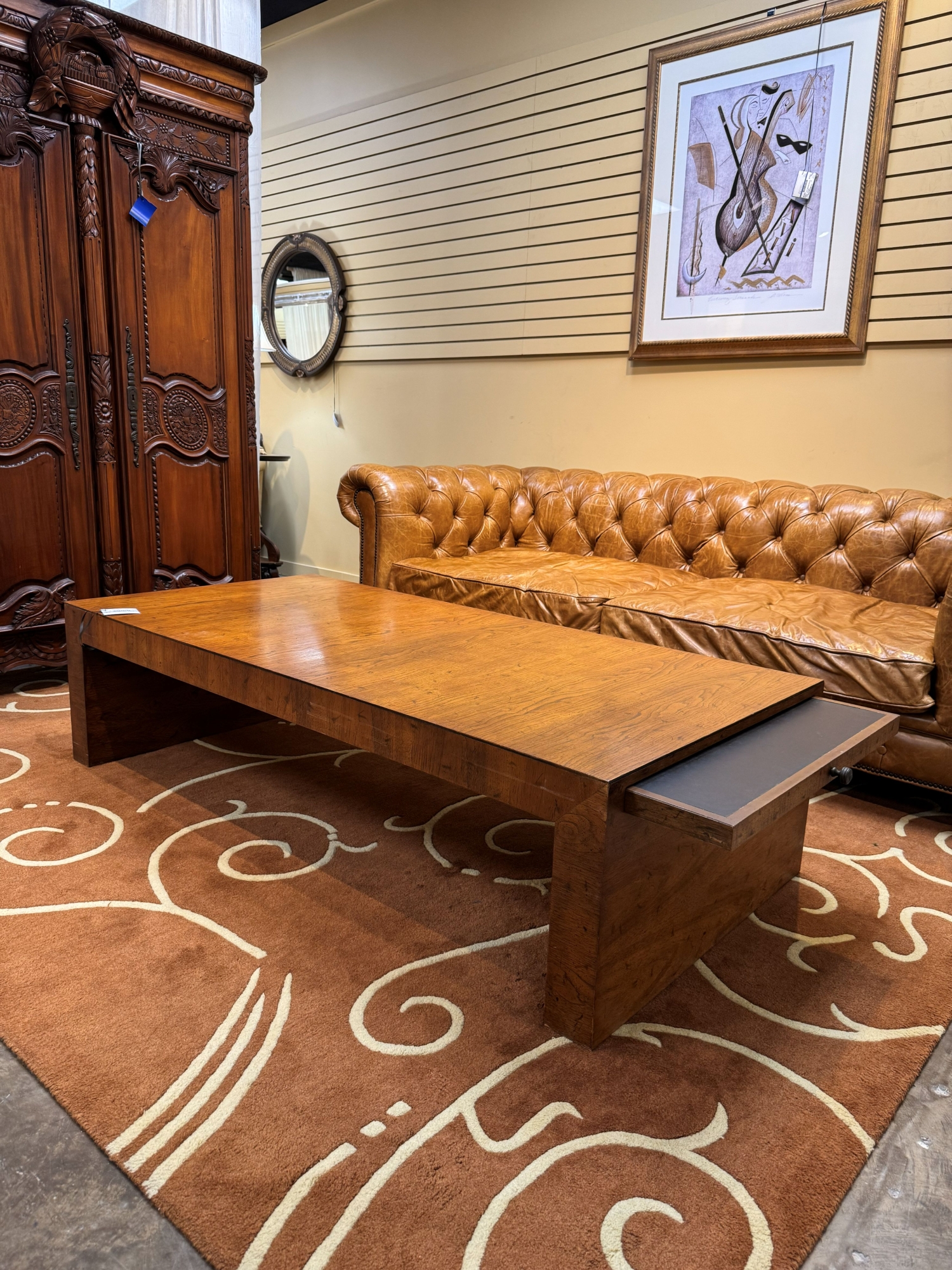 Drexel Wellington coffee table in a rustic medium finish. There is a pullout shelf on either side. 66"long x 32"wide x 17"high.