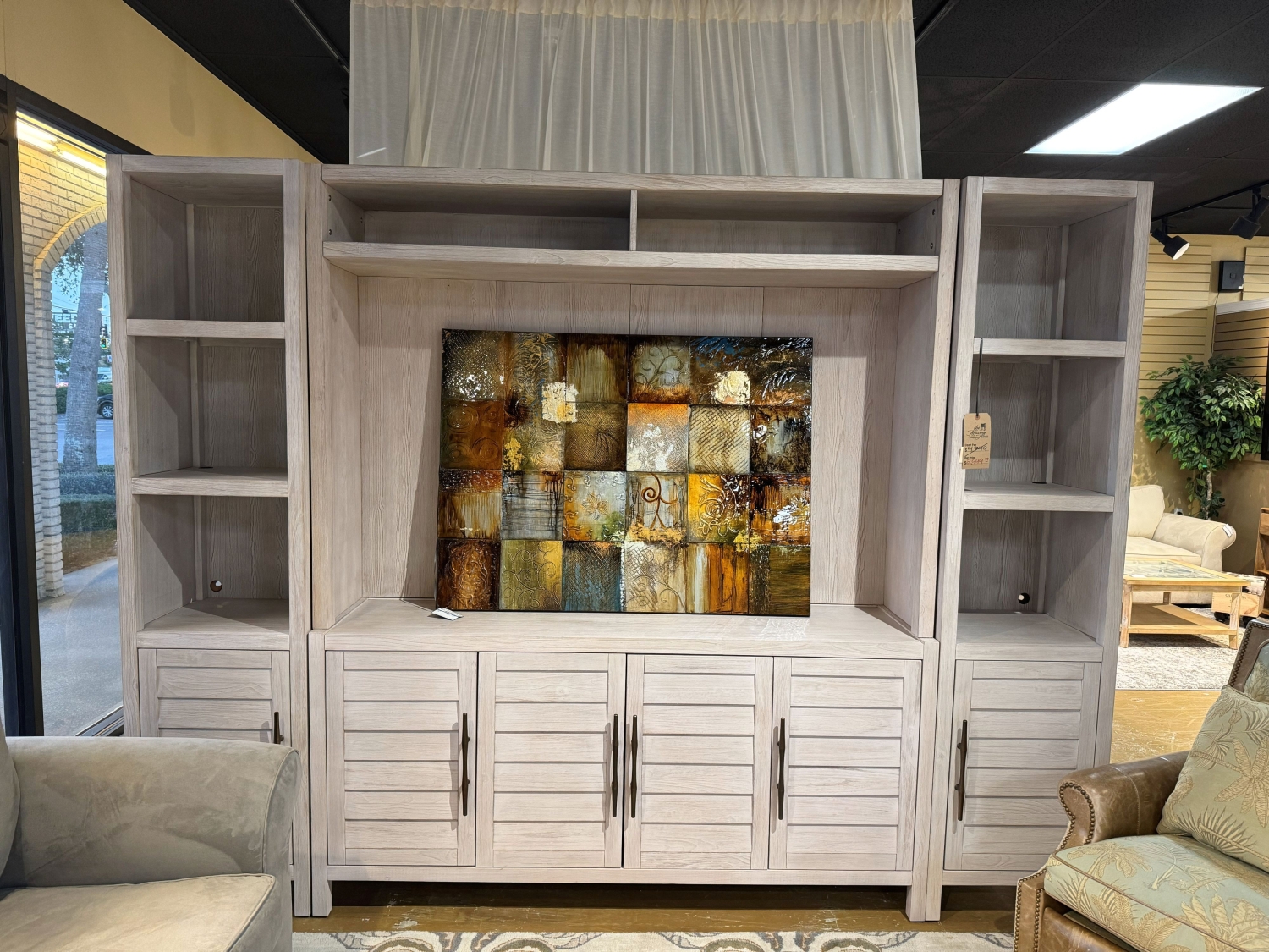 Universal Furniture four piece entertainment center in an antique white finish with paneled doors. Center space for a TV with surrounding shelf space. Measures 114"long x 20"deep x 86"high.
