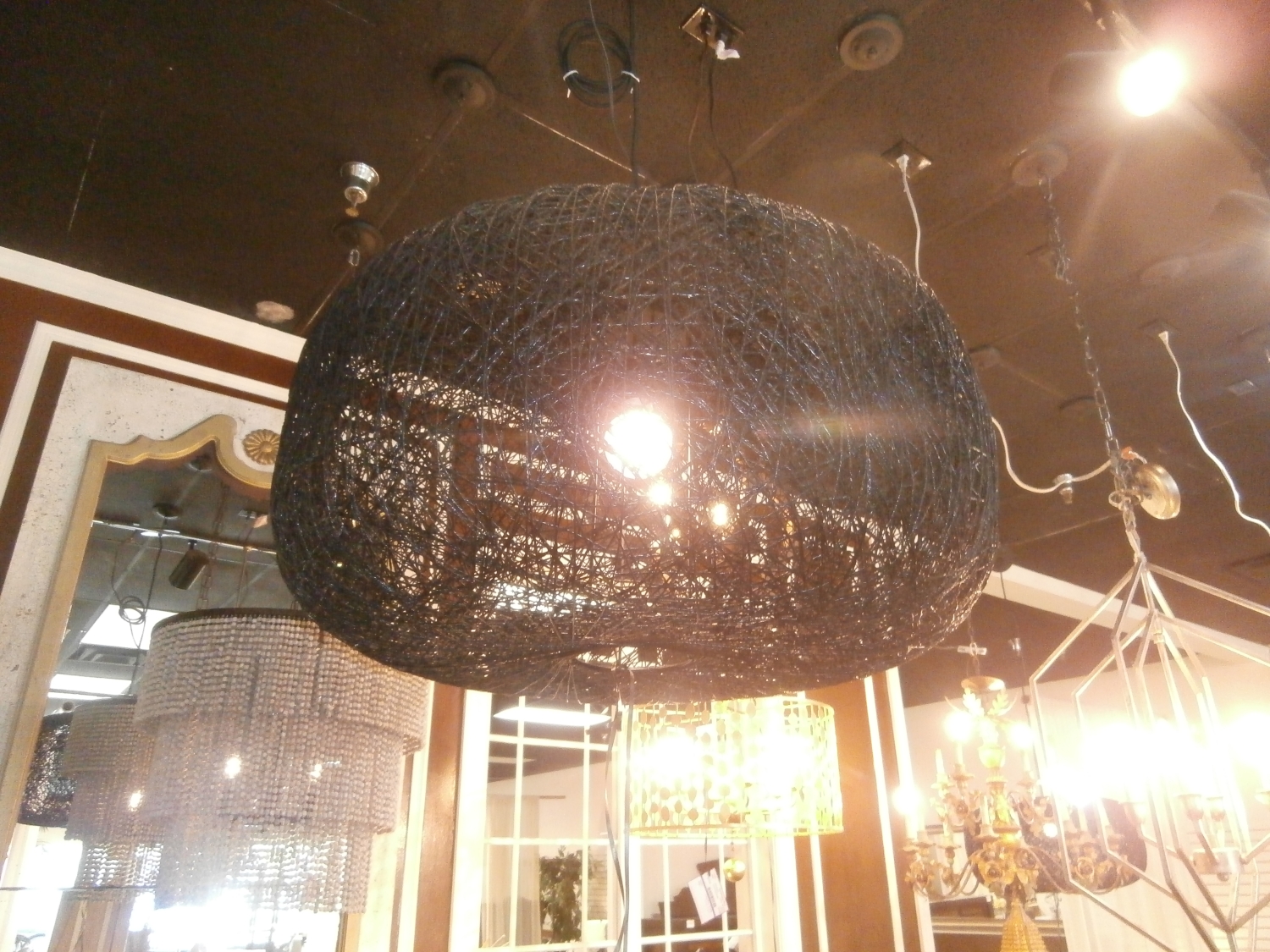 This West Elm peek-a-boo shade is inspired by paper lanterns. Casts a beautifully diffused light. Measures 30"DX16"H with two at time of post.