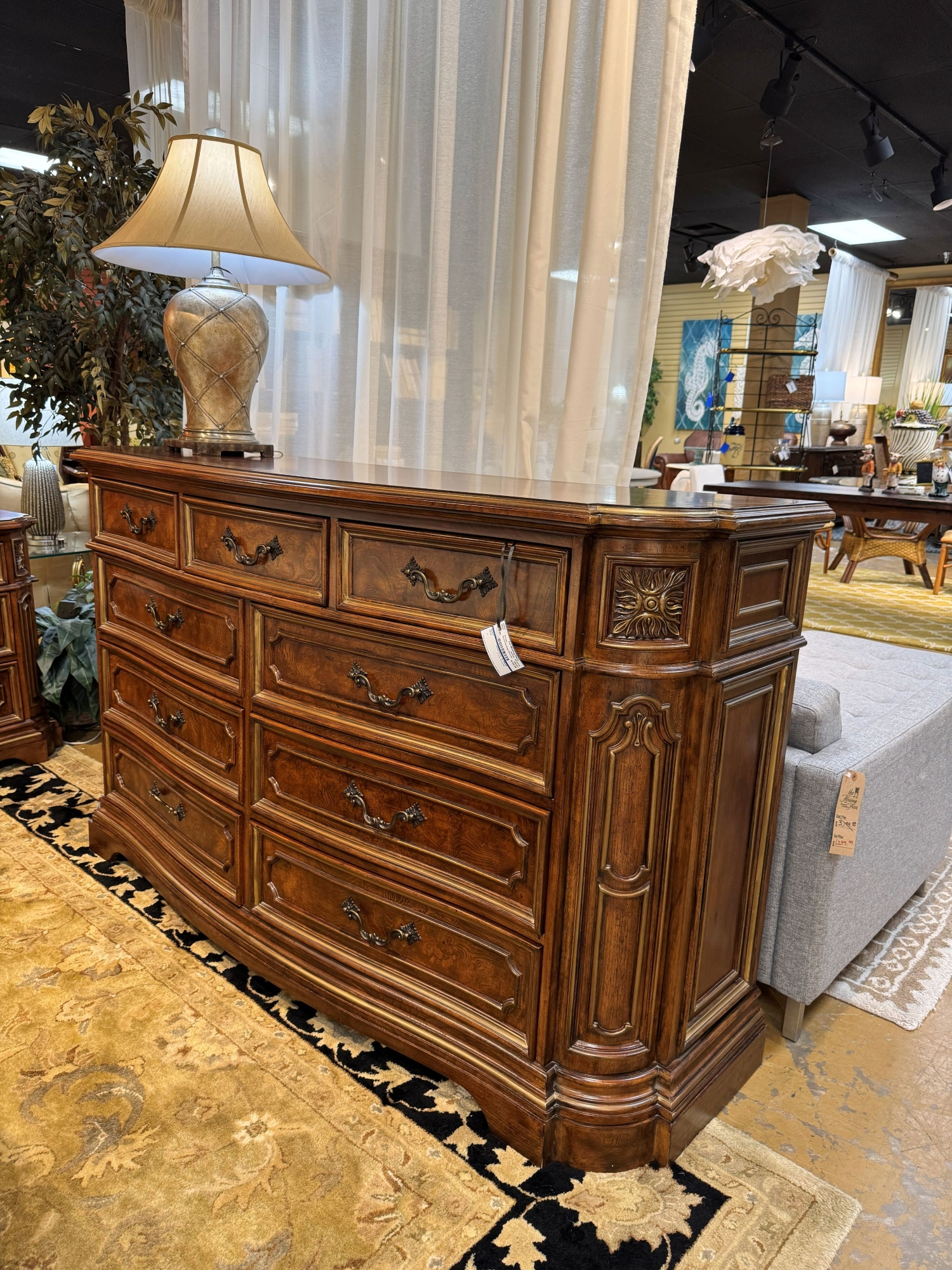 Drexel Heritage traditional style dresser in a dark finish with gold accents. There are nine drawers. 76"long x 23"deep x 44"high. At posting, we have the matching king bedroom set.