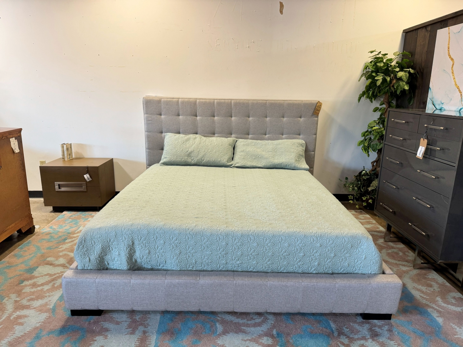 Bernhardt contemporary style tufted king bed in gray. Sleek, clean lines. Make this bed the focal piece for your master suite.
