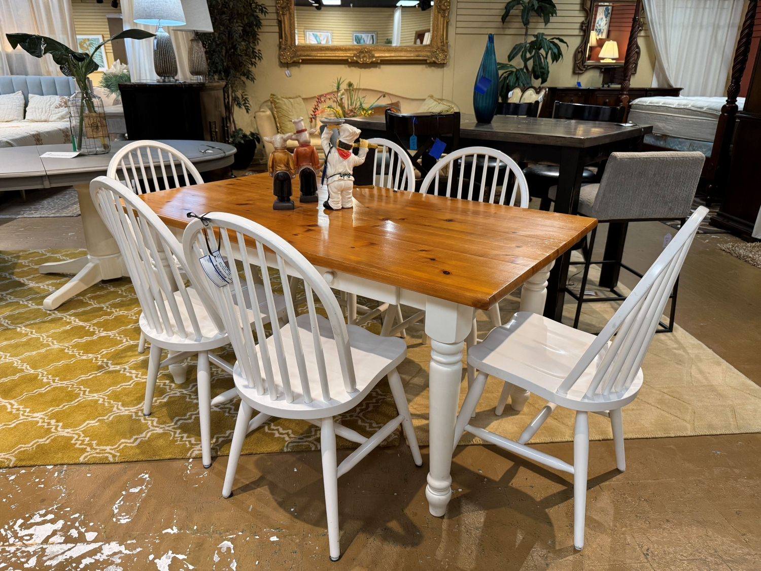 Rustic pine wood dining table on white legs with six white Windsor chairs. There are two drawers along the side. Measures 59"long x 33"wide.
