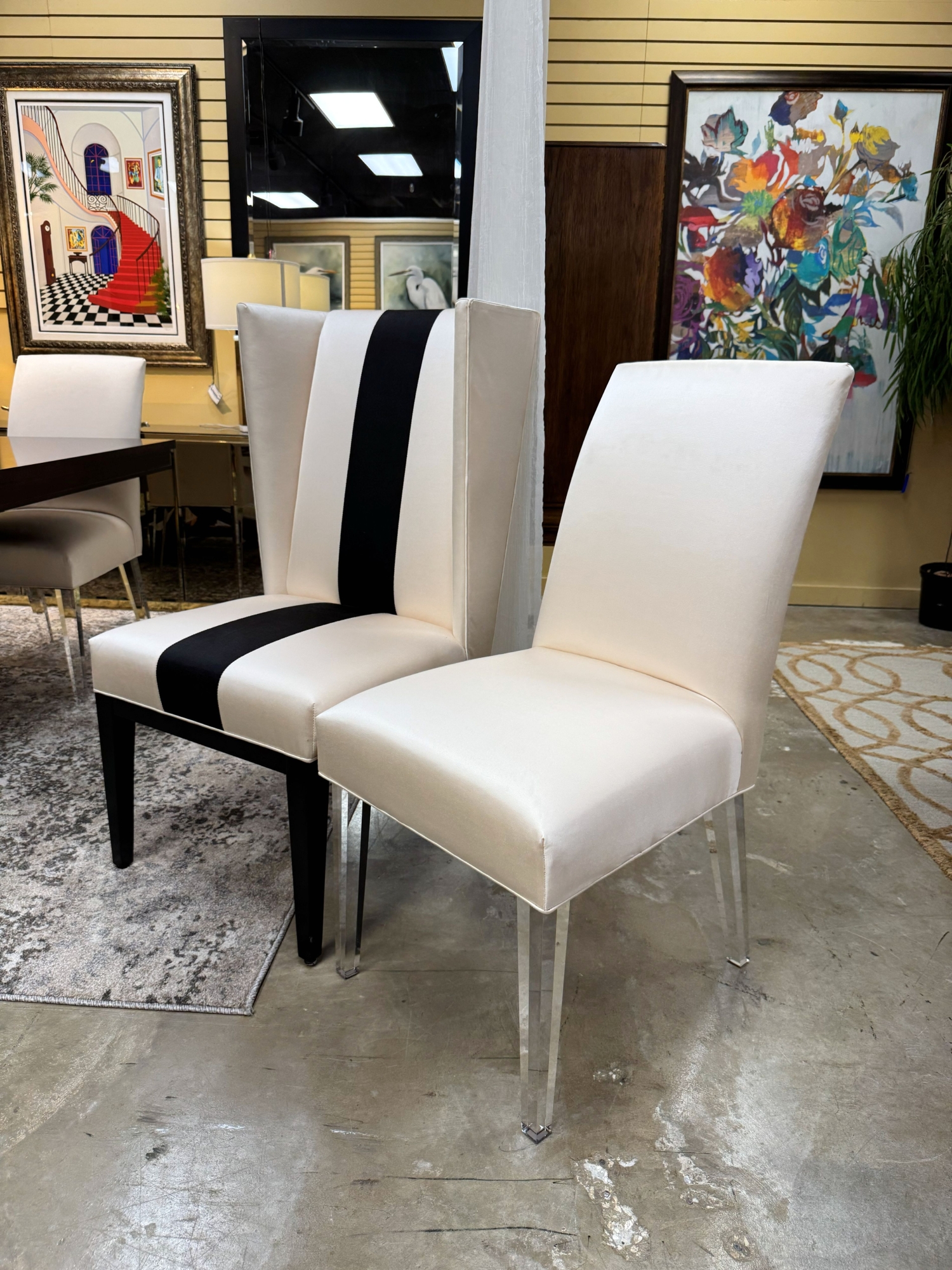 This is a set of six Designmaster dining chairs. There are two York highback chairs in pearl with black center stripe on black legs and four Electra chairs in pearl on clear acrylic legs. Stunning! 18*28*40.