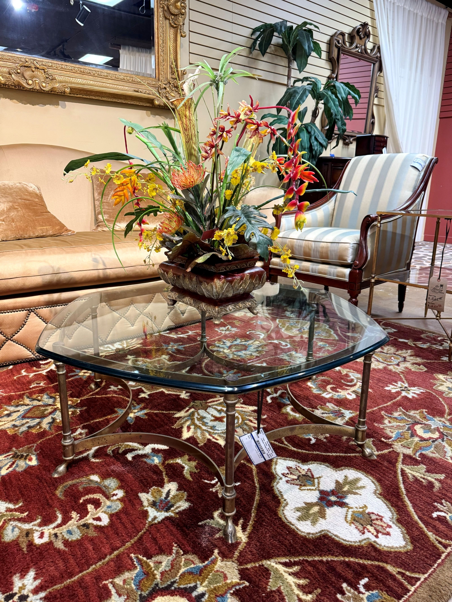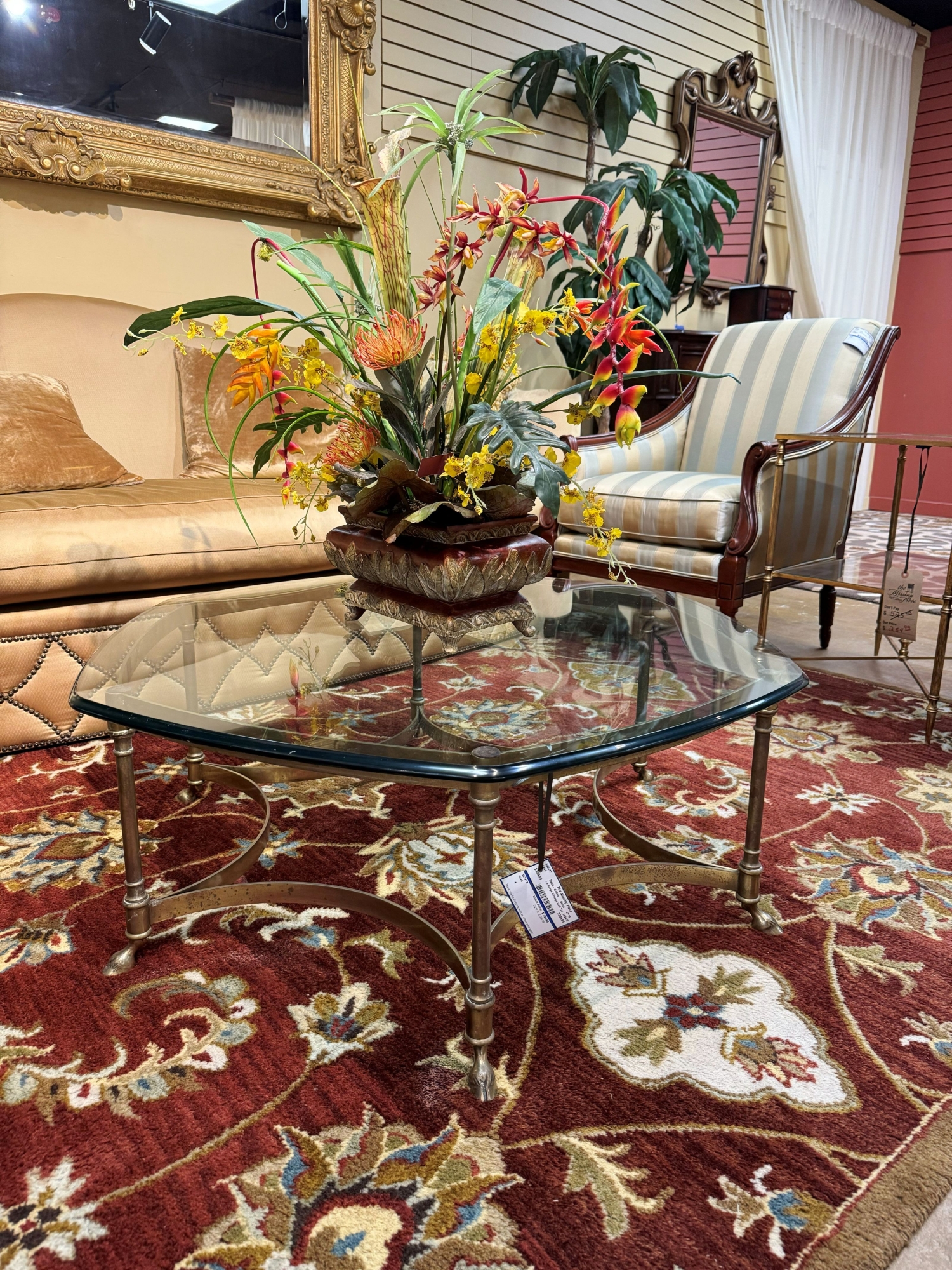 La Barge vintage glass top coffee table on brass metal base. Elegant! Perfect find for a traditional style home. 42"wide x 15"high.