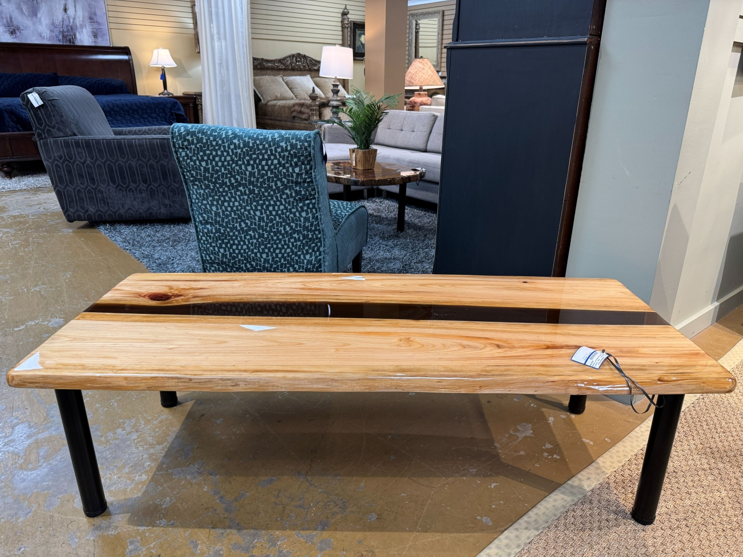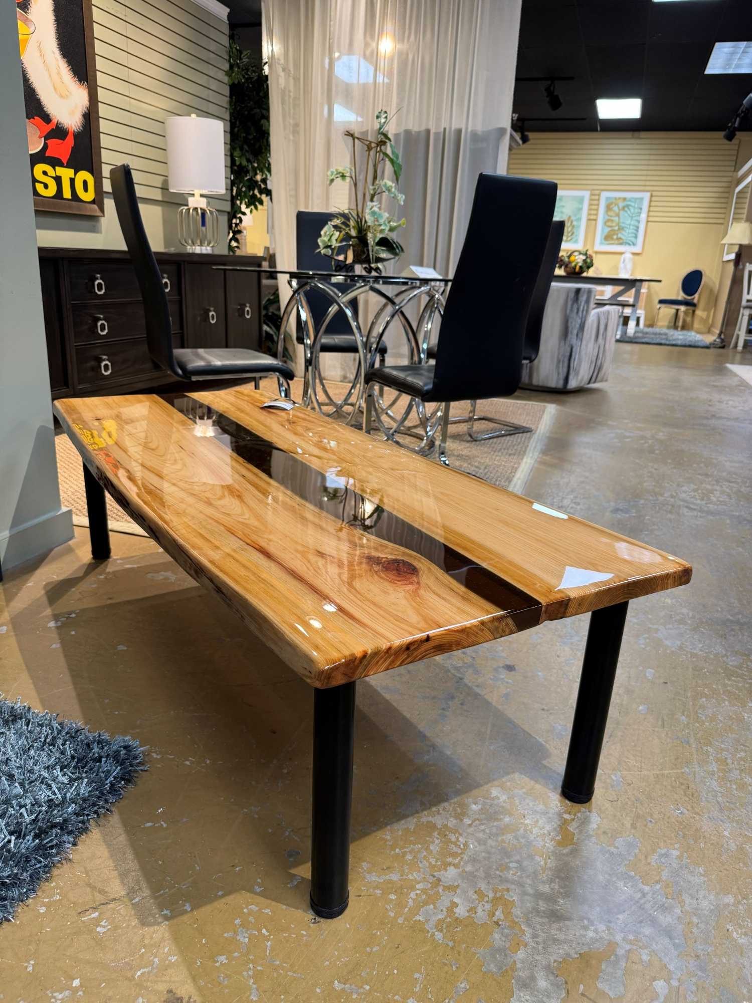Custom Cypress wood coffee table with epoxy finish on black metal legs. Perfect for a rustic or industrial style home. 60"long x 26"wide x 17"high.