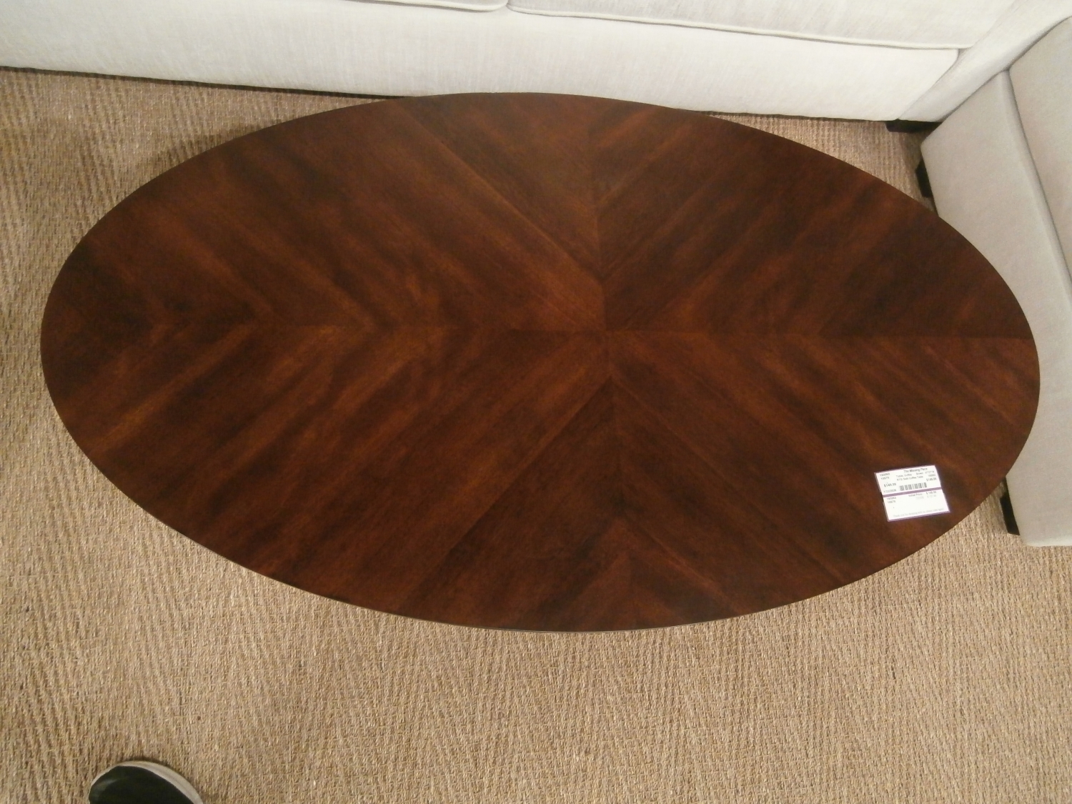 RTG Seth oval coffee table measuring 47"W,27"D,19"H in brown. Matching end table at post.