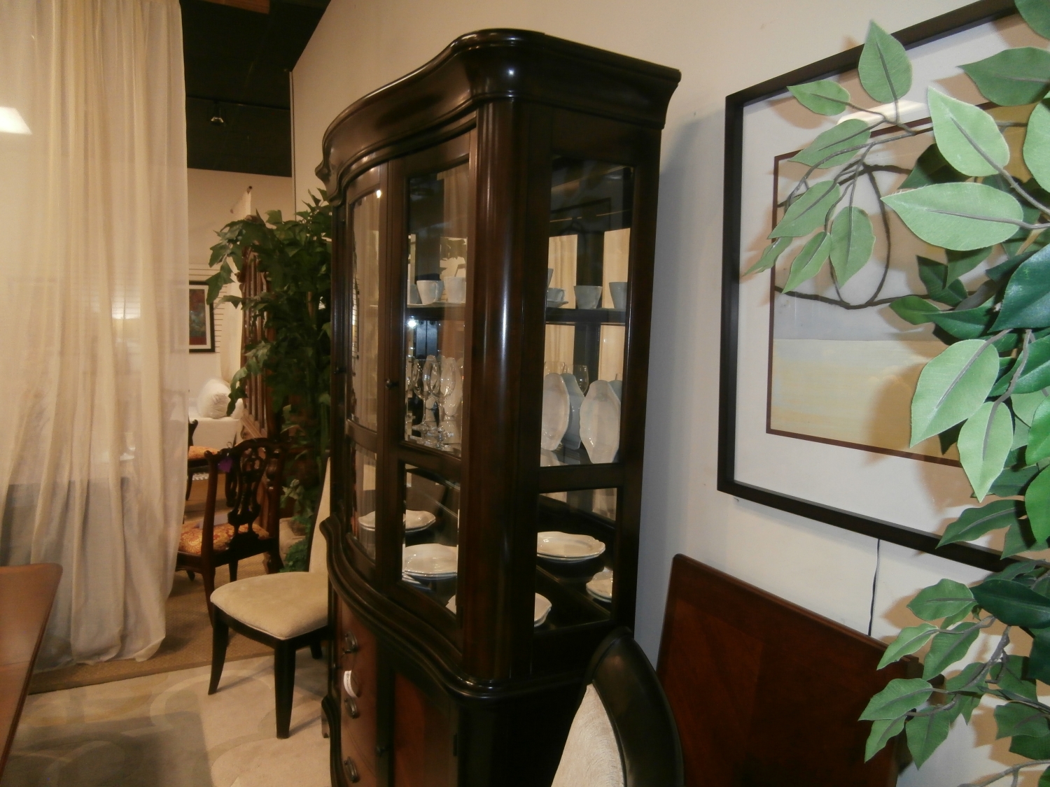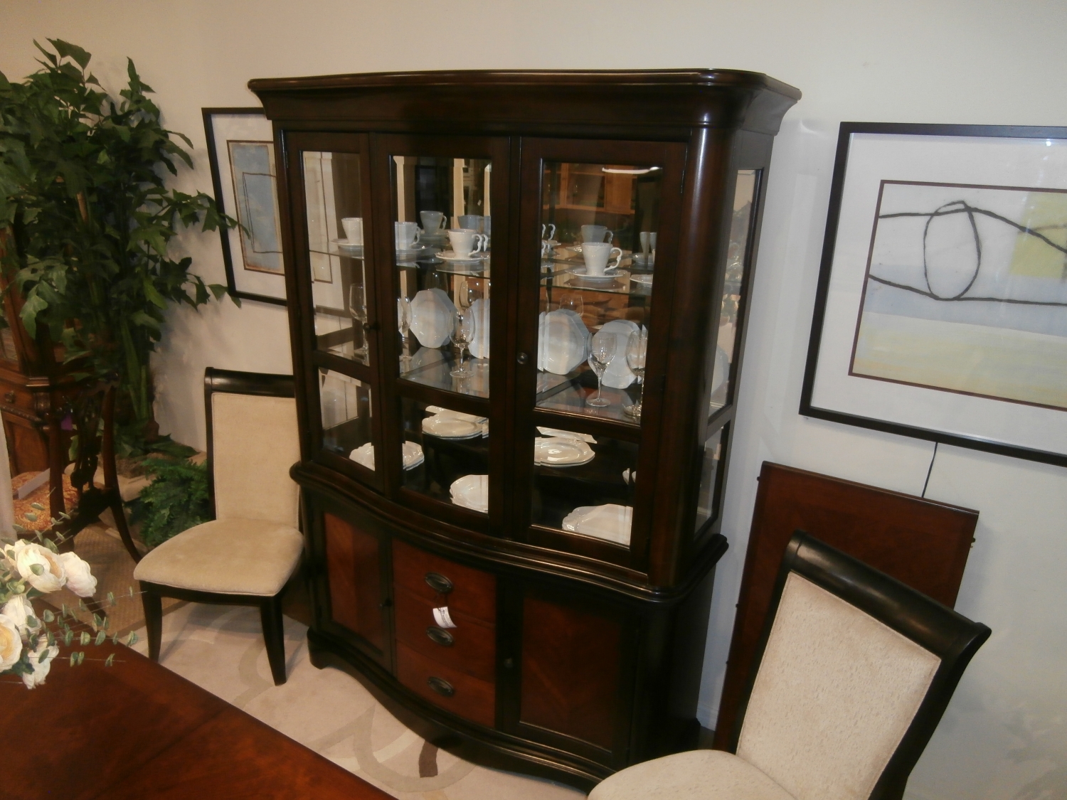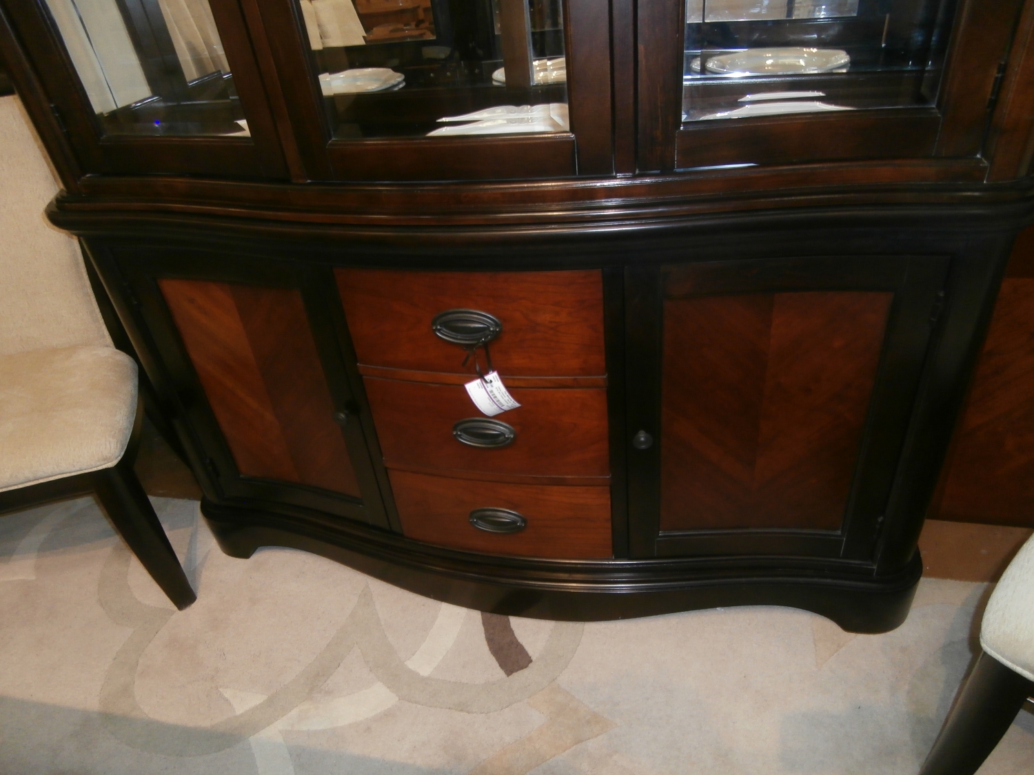 RTG two piece tone on tone china cabinet with glass for display on three sides. Measures 62"W,21"D,84"H.