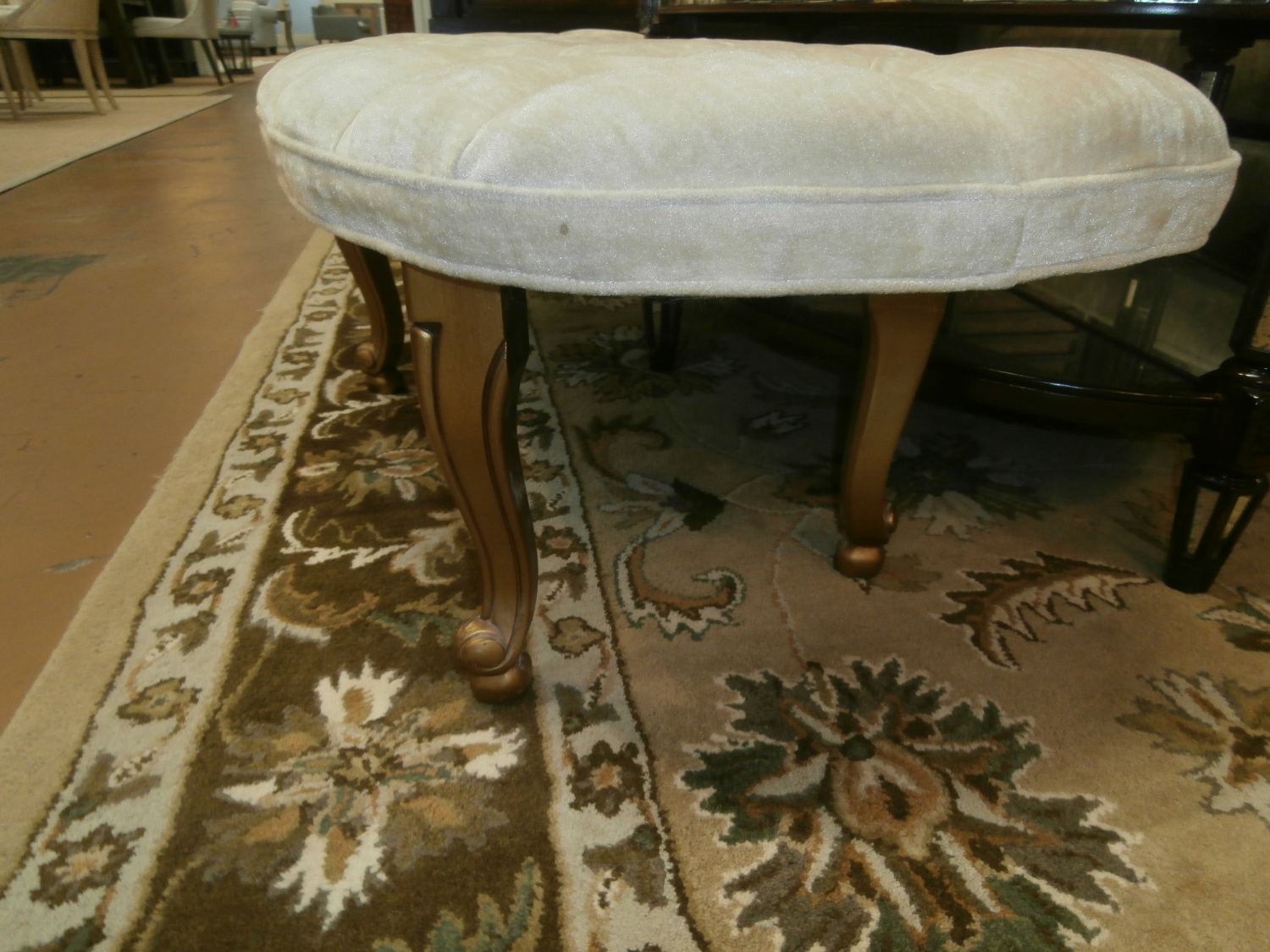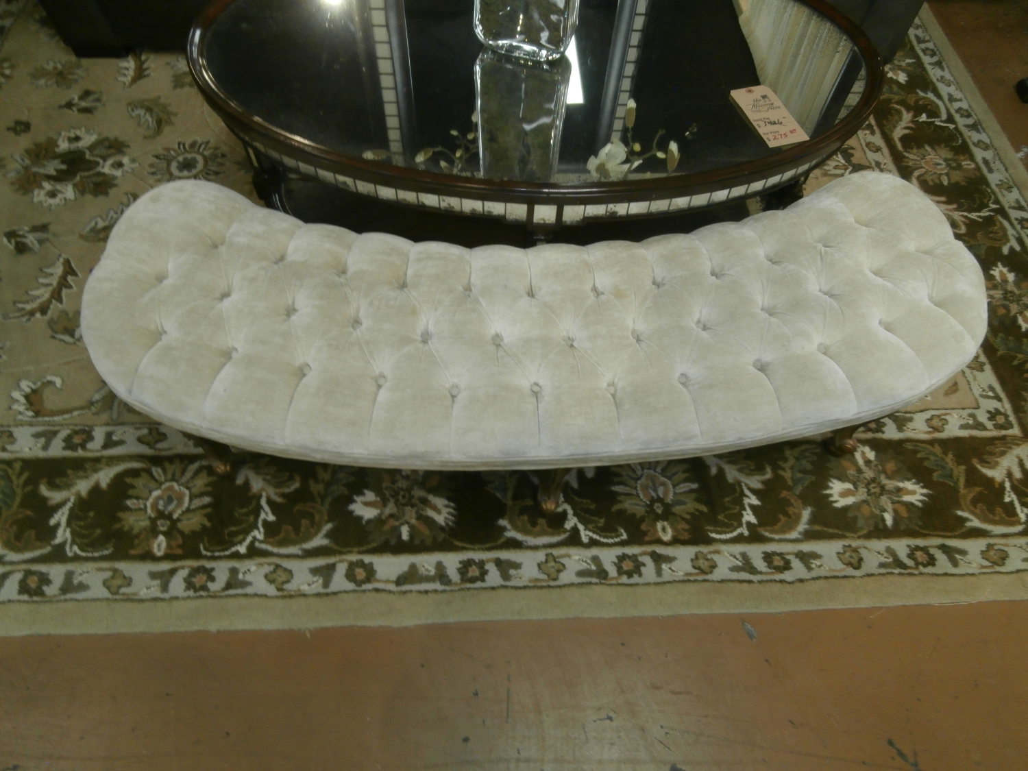 Vintage tufted bench measuring 60"W,17"D,15"H in beige and gold.