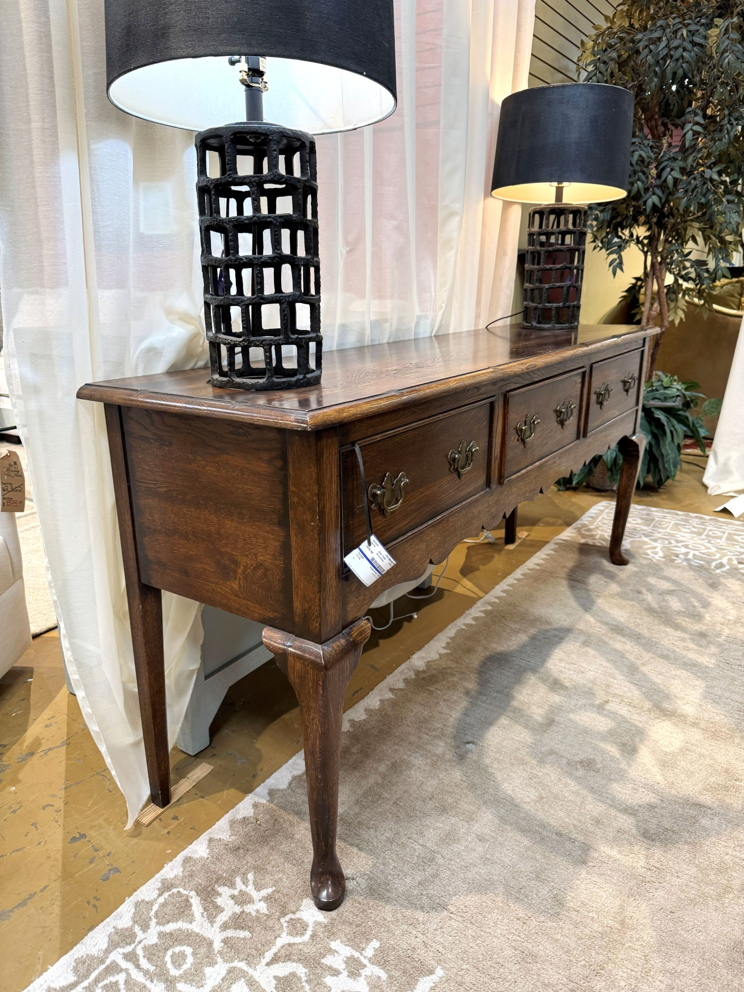 Annabelles traditional style dark oak buffet on cabriole legs. There are three drawers. 72"long x 19"deep x 34"high.
