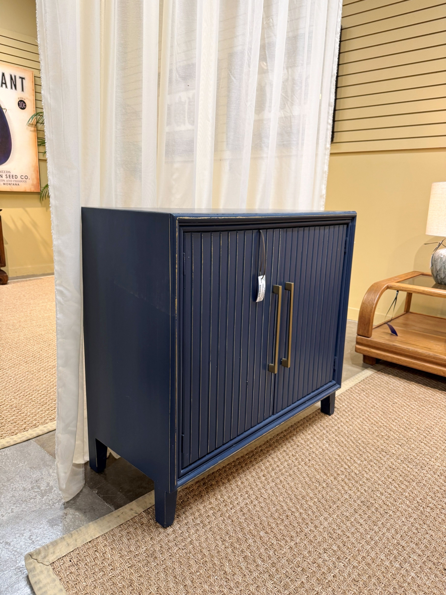 Riley two door ribbed console in a lightly distressed dark blue finish. There is one shelf inside. Great accent piece for any room. 37"long x 17"deep x 34"high. At posting, we have two.