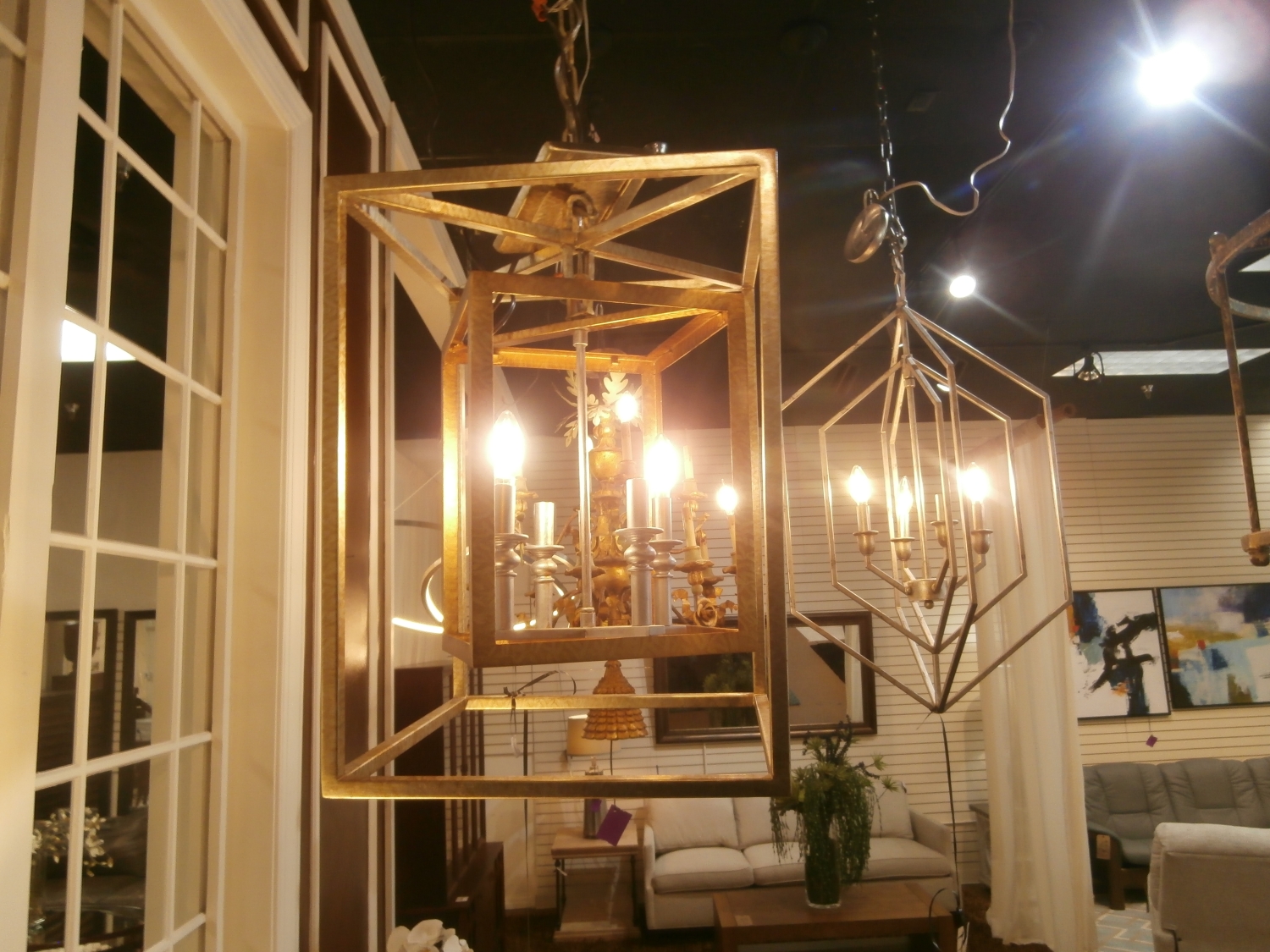 Gold metal chandelier measuring 22"W,16"D,16"H. Many different ones at post.