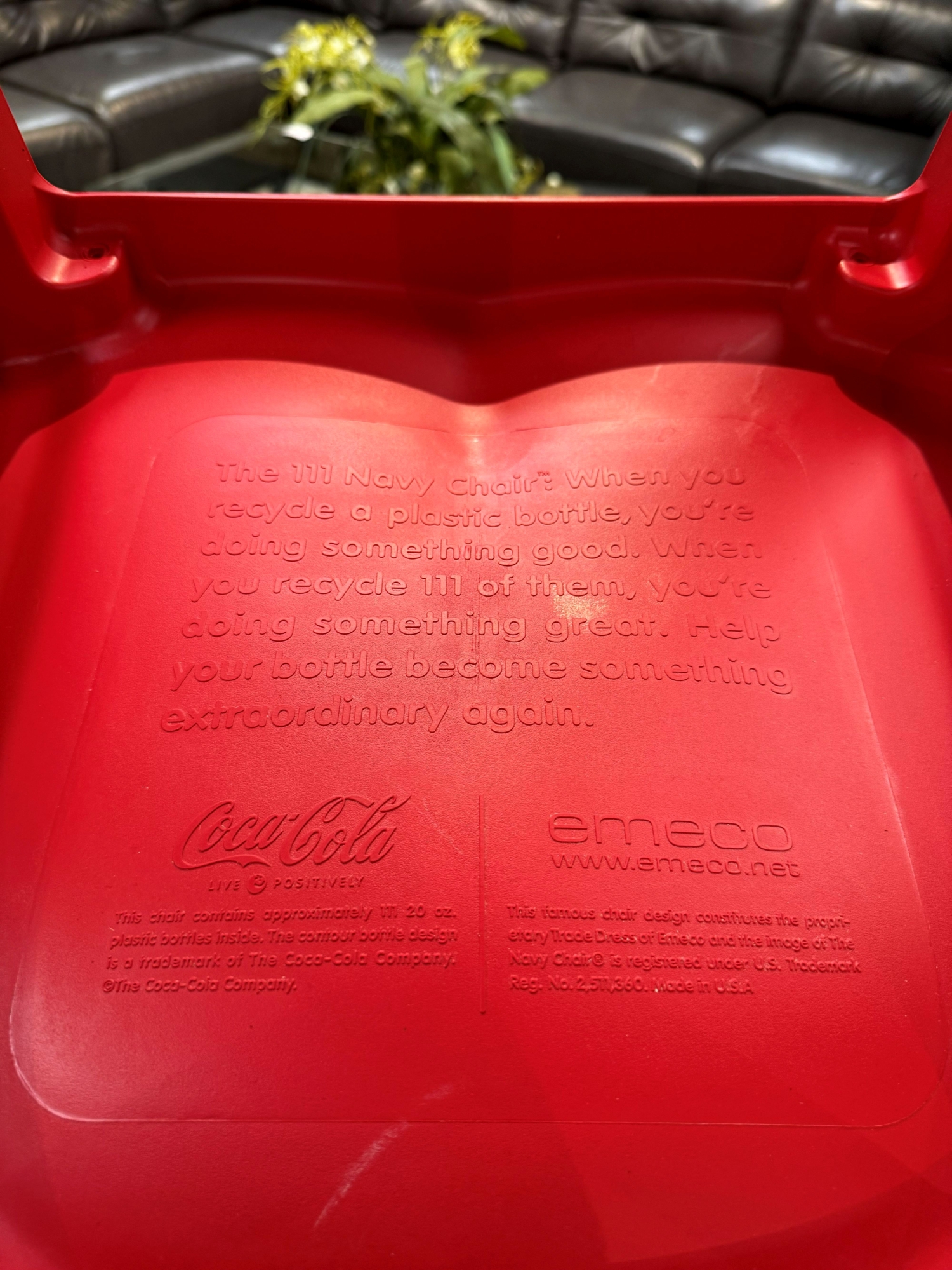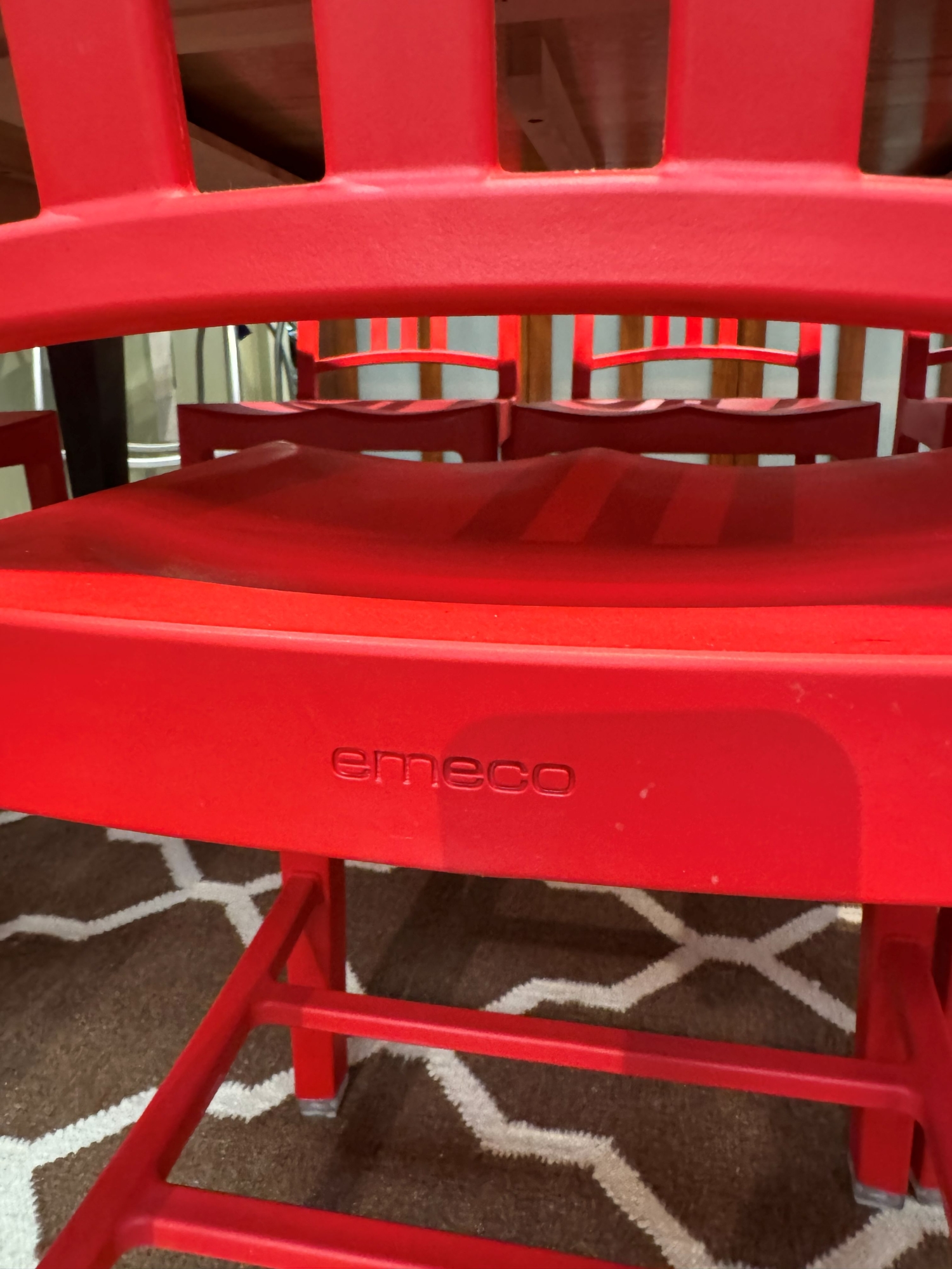 This is a set of eight Emeco Coco Cola dining chairs in red made from recycled plastic bottles. Made to last, these durable chairs can be used indoors or outdoors. Each measures 16*19*35.