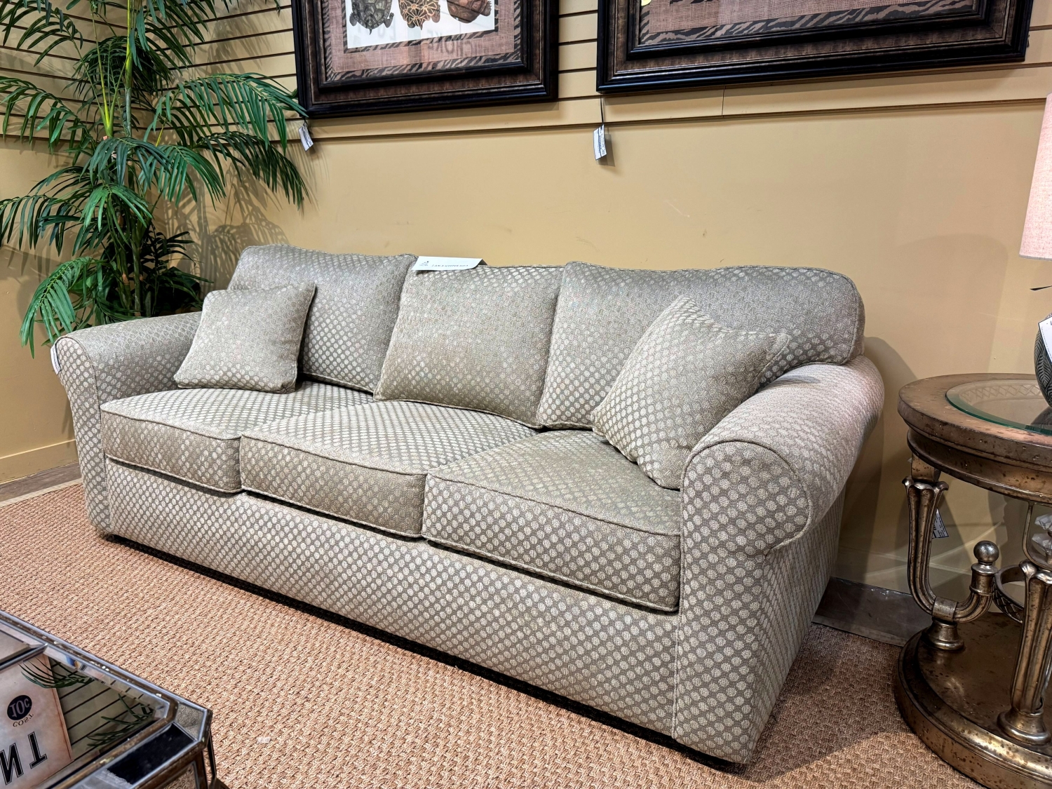 Transitional style sleeper sofa in a sage patterned upholstery. Comes with two patterned accent pillows. Nice, rolled arms. Comfortable as well. 84"long x 38"deep x 34"high.