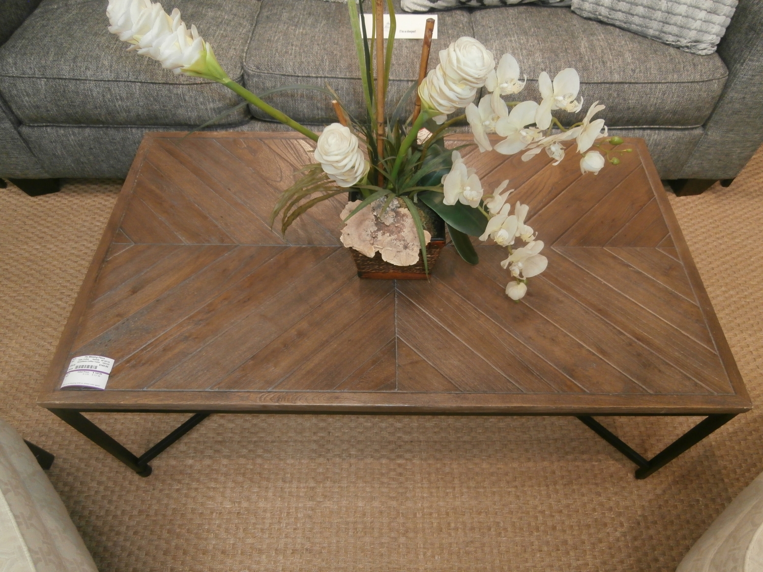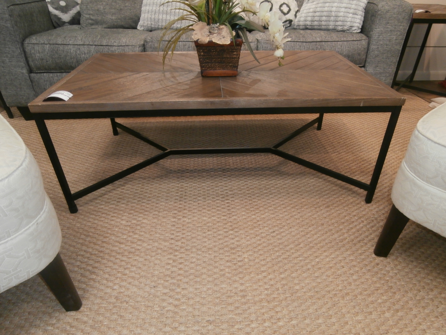 Wood/Metal coffee table measuring 48"W,28"D,18"H in natural and black. Matching end tables at post.