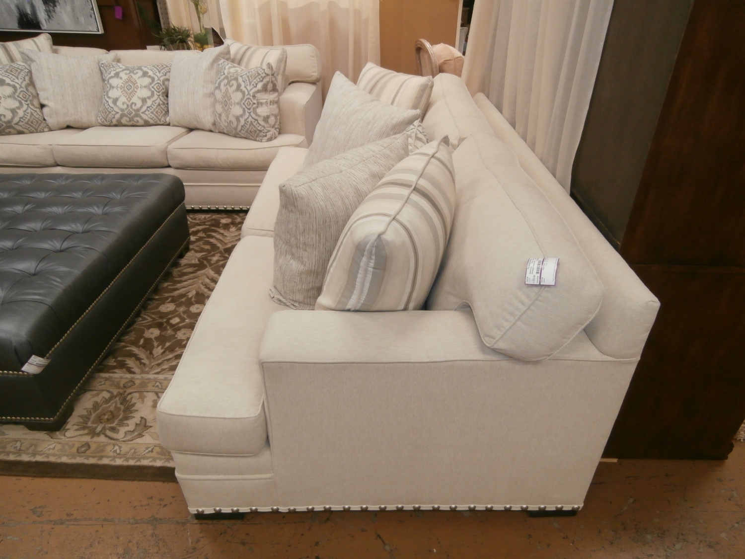 Huntington House two cushion sofa with nailhead trim. Measures 84"W,45"D,37"H in creme. Matching larger sofa at time of post.