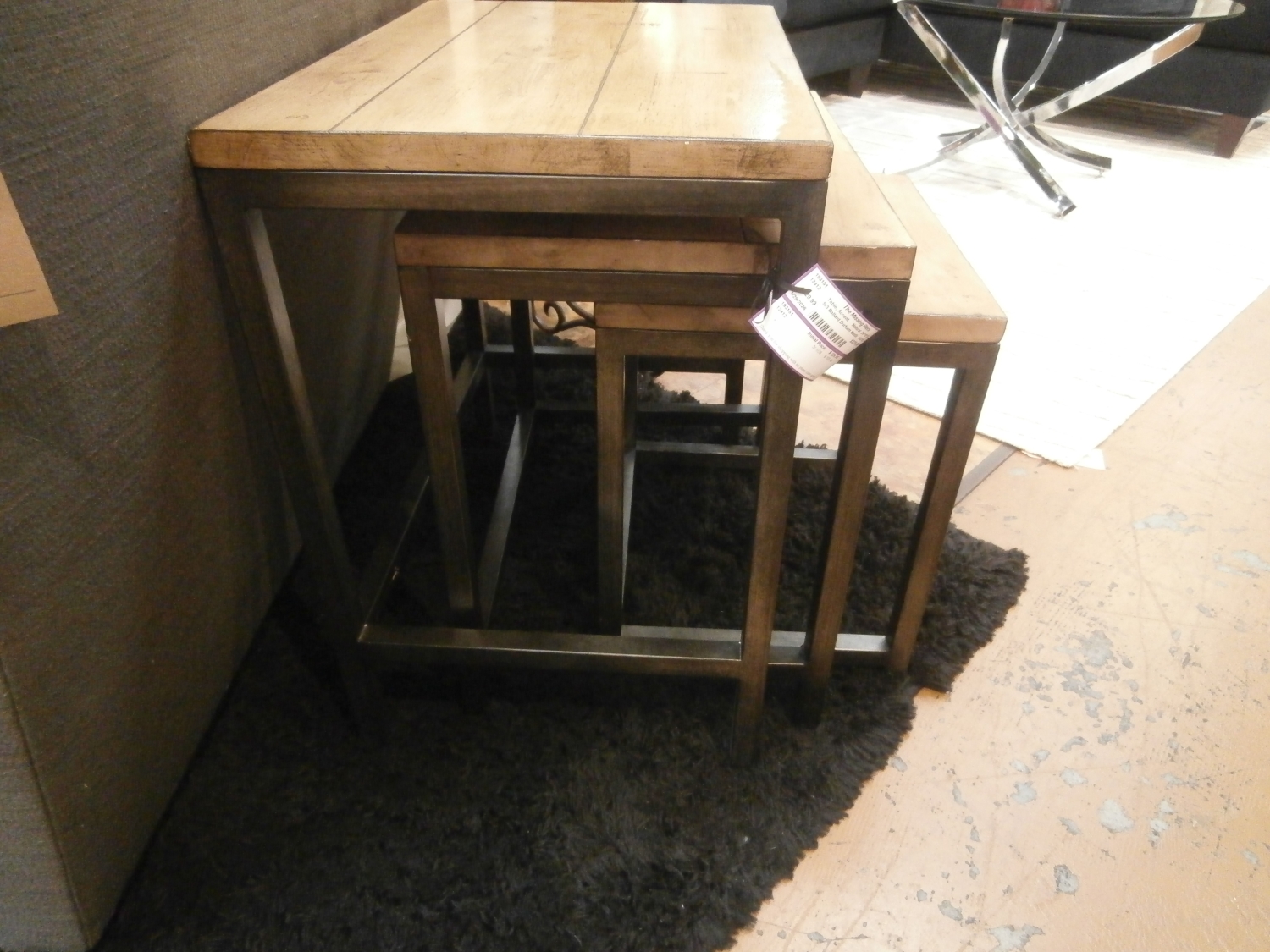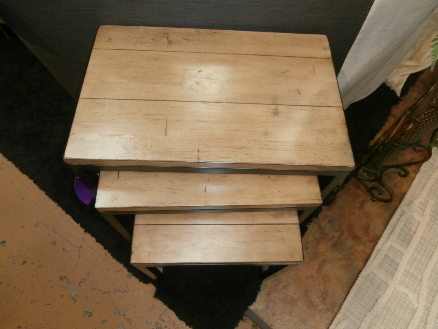 Item #193151. The architectural design of these nesting tables is based on an antique bricklayer's table. Planked wood tops are heavily distressed and finished to bring out their natural grain and character. S/3 measures 24"W,16"D,24"H...