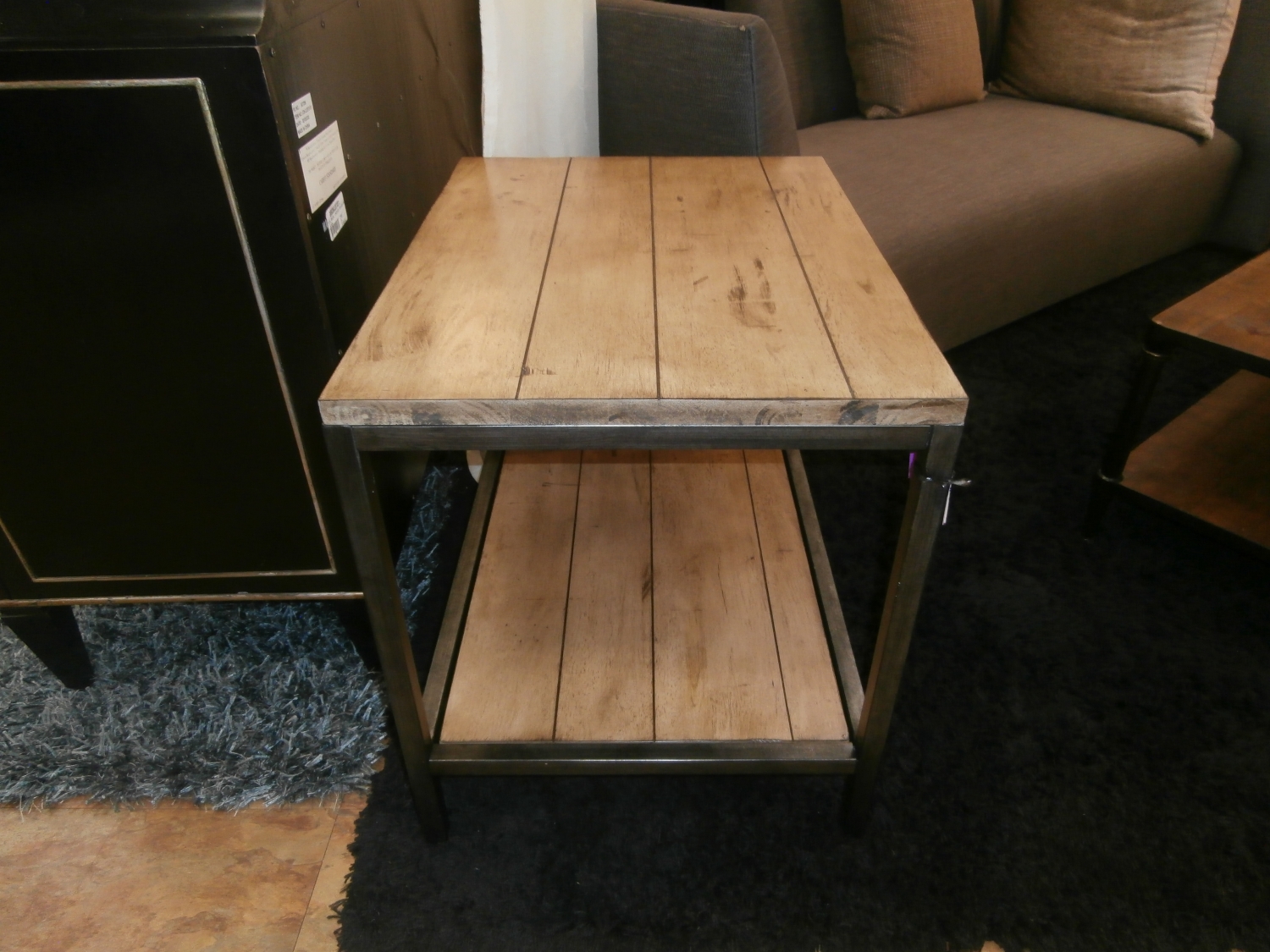 The architectural design of this table is based on an antique bricklayer's table. The planked wood top is heavily distressed and finished to bring out the natural grain and character. Measures 20"W,27"D,24"H.