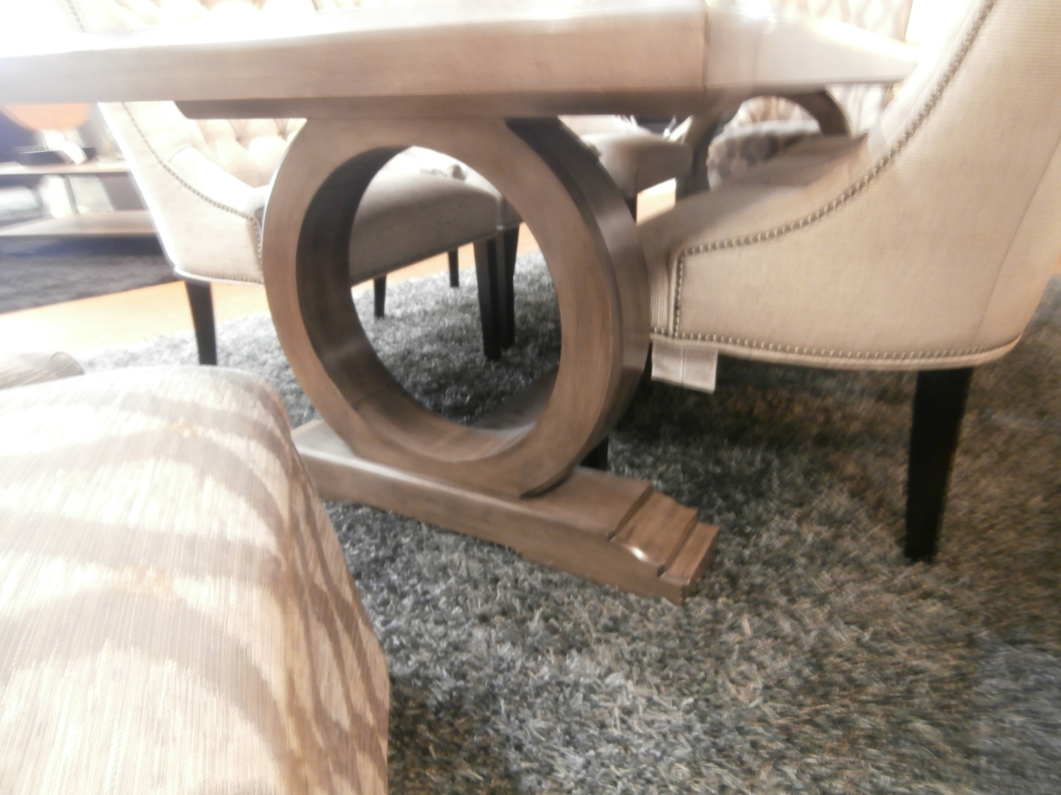 Larry Laslo loves circles. It's the geometry of harmony and unity. Two perfect circles joined with a floor-level stretcher form the base of this 21st Century trestle table. Comes with 8 Jessica Charles chairs. 116"W,42"D,30H